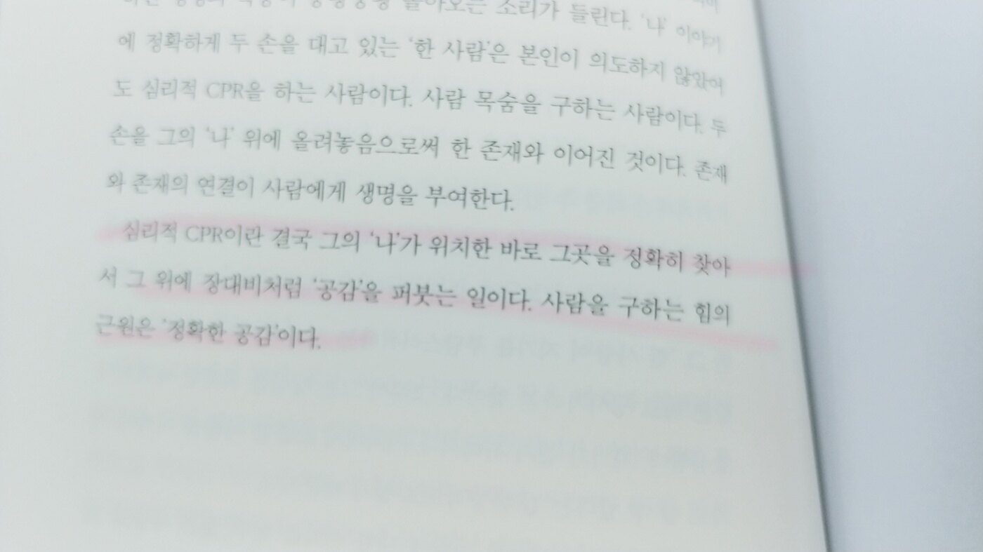 심리적CPR이란 결국 그의 ‘나‘가 위치한 바로 그곳을 정확히 찾아서 그 위에 장대비처럼 ‘공감‘을 더붓는 일이다.