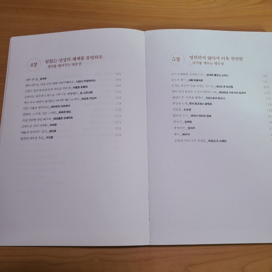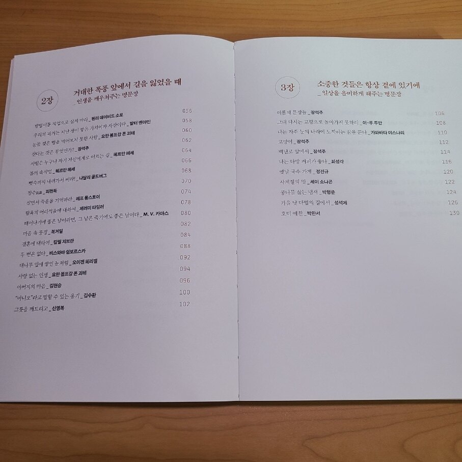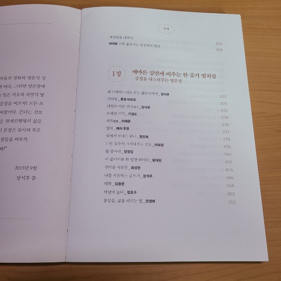 5가지 테마로 나뉘어져 있는데 훑어보면서 보니 (스포(?) 당하기 싫어서 미리 읽는 걸 망설이는 경우는 또 처음이군요. (매일 아침에 새 문장을 접하고 싶어서ㅎㅎ)) 대부분의 글에서 비슷한 향이 나기는 합니다. 주제 면에서는 삶에 대한 성찰과 깨달음에 관한 글이 많고, 문학적이고 감각적인 표현이 돋보이는 글들이 많아요.