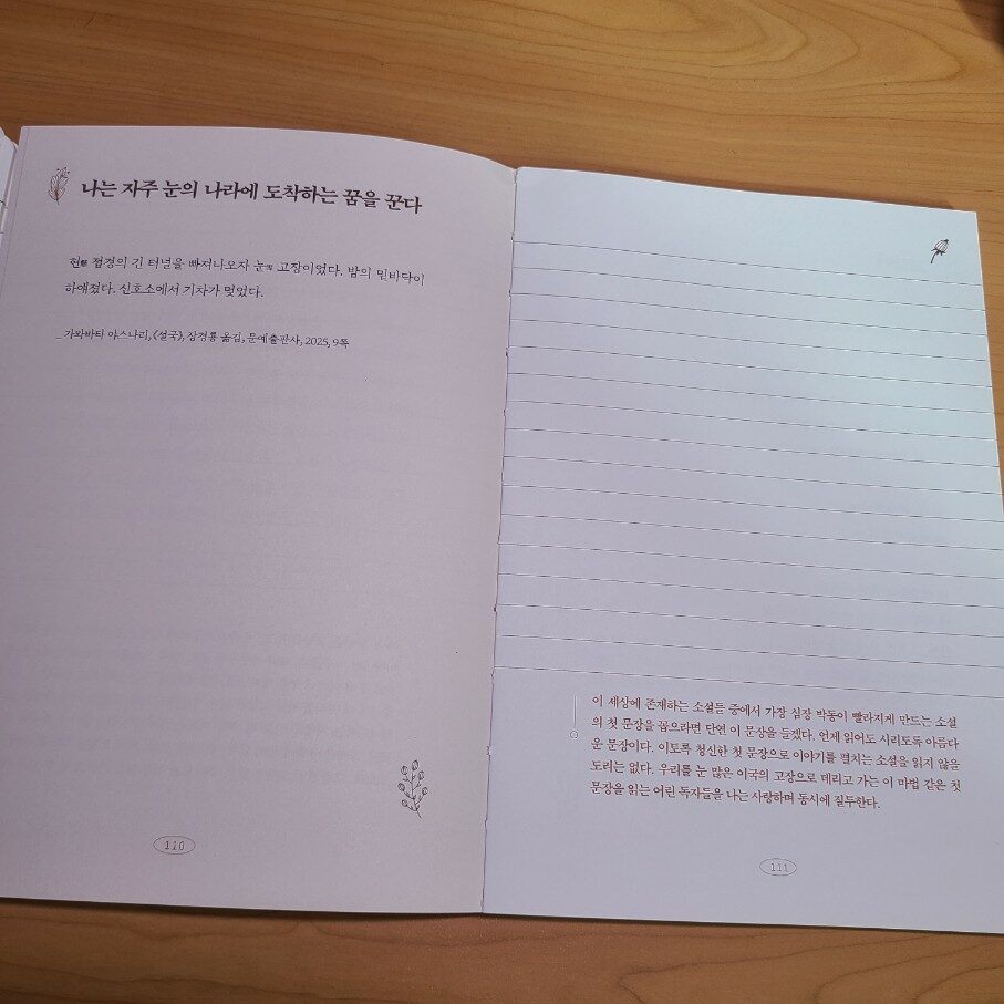 그래선가 올초에도 필사 노트, 필사용 만년필까지 장비(?)는 다 준비해두고 필사감을 딱히 구하지 못 해 시작을 못 했어요. 책을 읽다가 기억에 남는 문구가 나오면, 이 문장 마음에 담아두고 싶다, 하면서도 그게 실천으로 잘 이어지진 않더라고요.