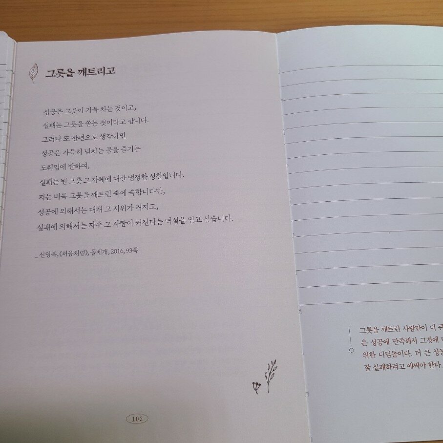 각각의 글들은 한 쪽 내외라 그리 길지 않아요. 매일 아침 한 두 개 정도만, 읽고 느끼고 따라쓰면 딱 좋을 것 같아요.