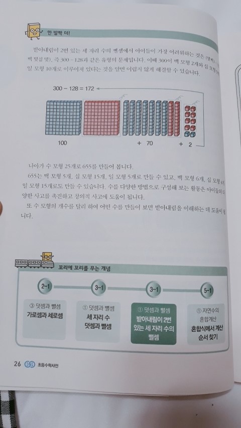 수모형의 갯수를 예시로 들어서 수를 만들어보며 받아내림을 이해하기 쉽게 설명해놓았어요.