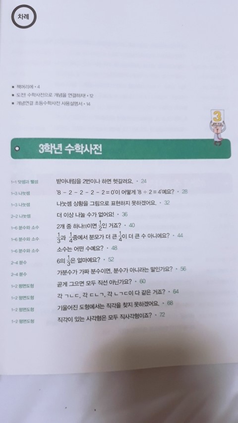 개념연결 3,4학년초등수학사전에서는 짧은 만화같은 설명으로 수학사전을 이용해서 개념정리를하고