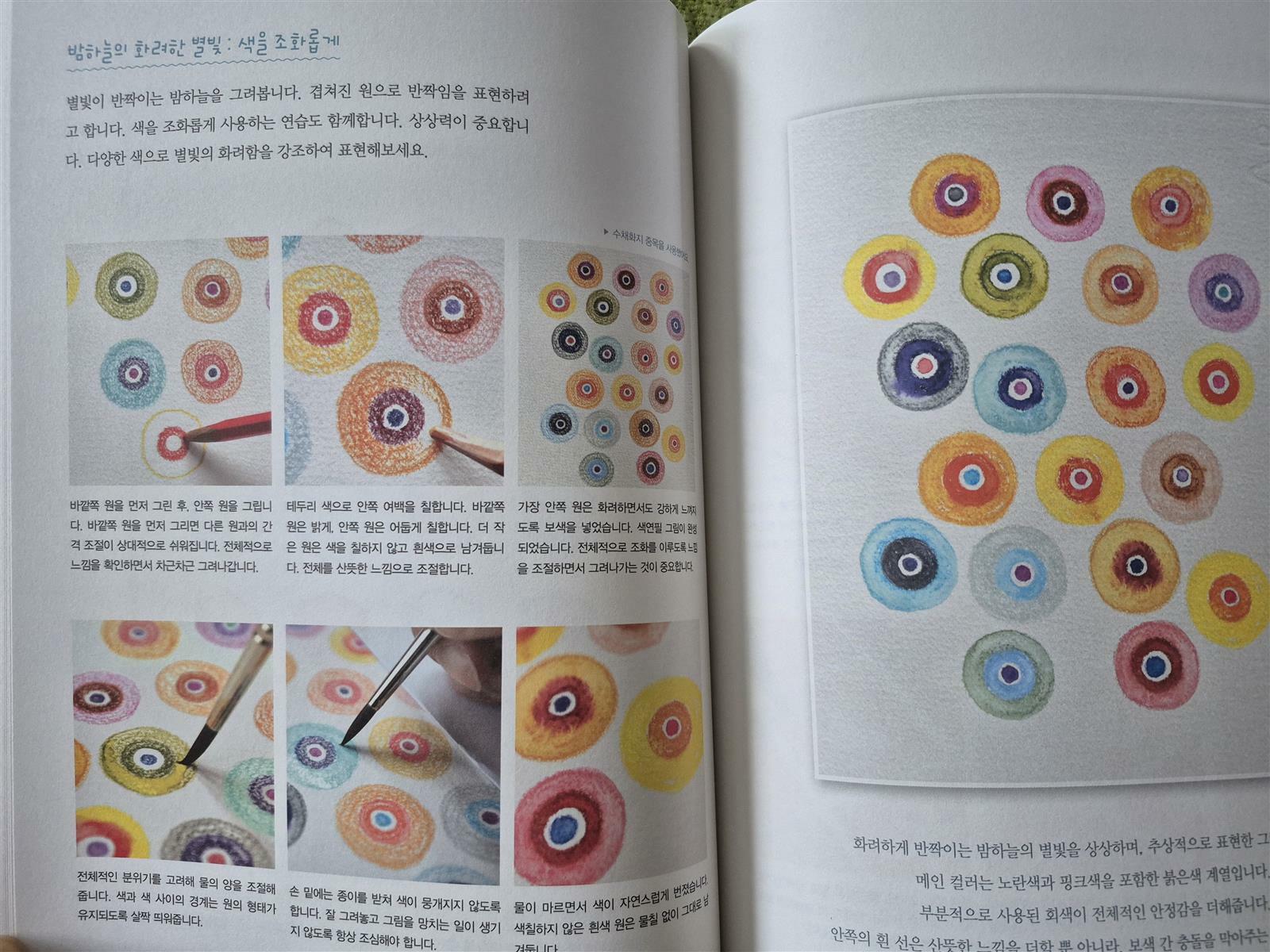 이 책은 수채색연필로 대상을 먼저 그리고 난 뒤 붓에 물을 묻혀 색을 번지게 하면 수채화 같은 효과가 나타나는데, 그 과정을 차근차근 알려주는 책이랍니다.