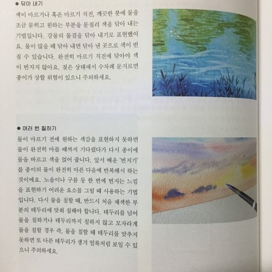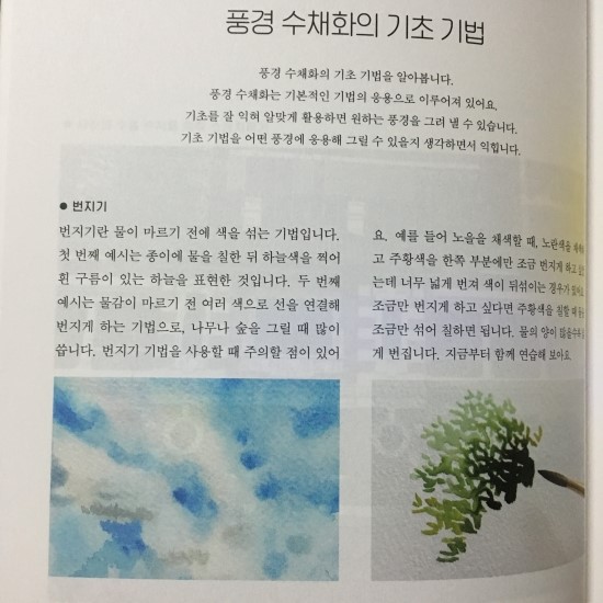 풍경 수채화를 그리는데 있어 처음부터 끝까지 모든 과정이 담겨 있고 각 과정마다의 설명이 자세히 나와 있다.