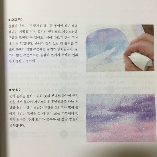 또 겹치기,번지기, 그라데이션, 닦아내기, 여러 번 칠하기, 휴지 찍기, 붓 털기 등 그림에 쓰이는 7가지 기초 기법을 알기 쉽게 보여주고 있다. 이외에도 더 다양한 기법이 있겠지만 가장 기초가 되는 기법을 소개해 준다.