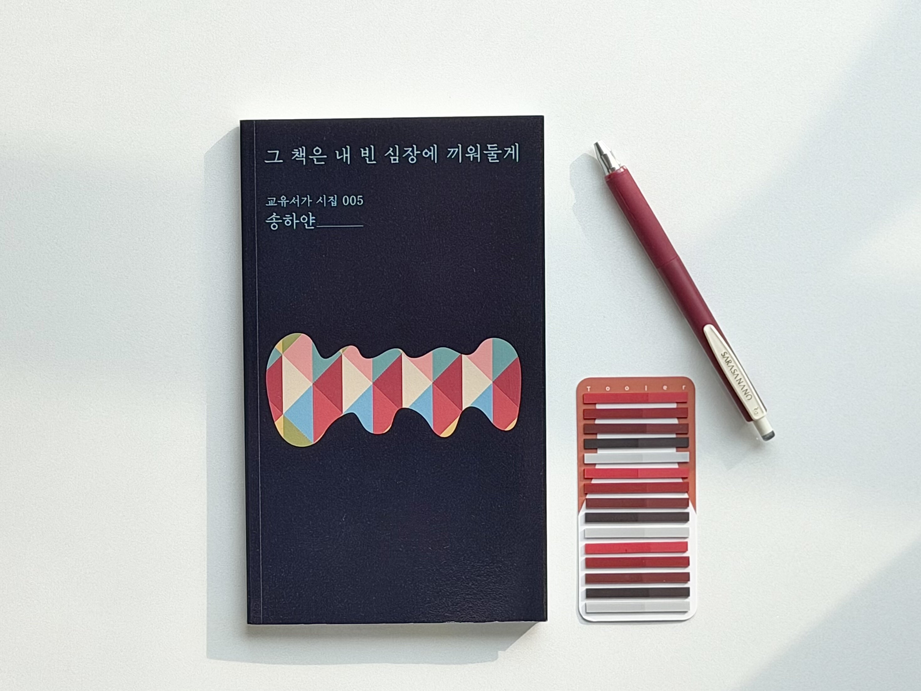 '교유서가 시집' 시리즈 다섯 번째 작품이다. 소후에 시인의 <우주는 푸른 사과처럼 무사해>, 원성은 시인의 <비극의 재료>, 리사 시인의 <우리의 슬픔은 전문적이고 아름다워>, 기혁 시인의 <소설책>에 이어 송하얀 시인의 <그 책은 내 빈 심장에 끼워둘게>가 나왔다. 교유서가의 시집이 특별한 것은 표지 빛깔에 맞는 컬러로 내지에 그라데이션을 줬다는 점이다. 심플한 표지 이미지도 마음에 들고, 페이지를 펼치면 만날 수 있는 은은한 색감도 너무 예쁘다.