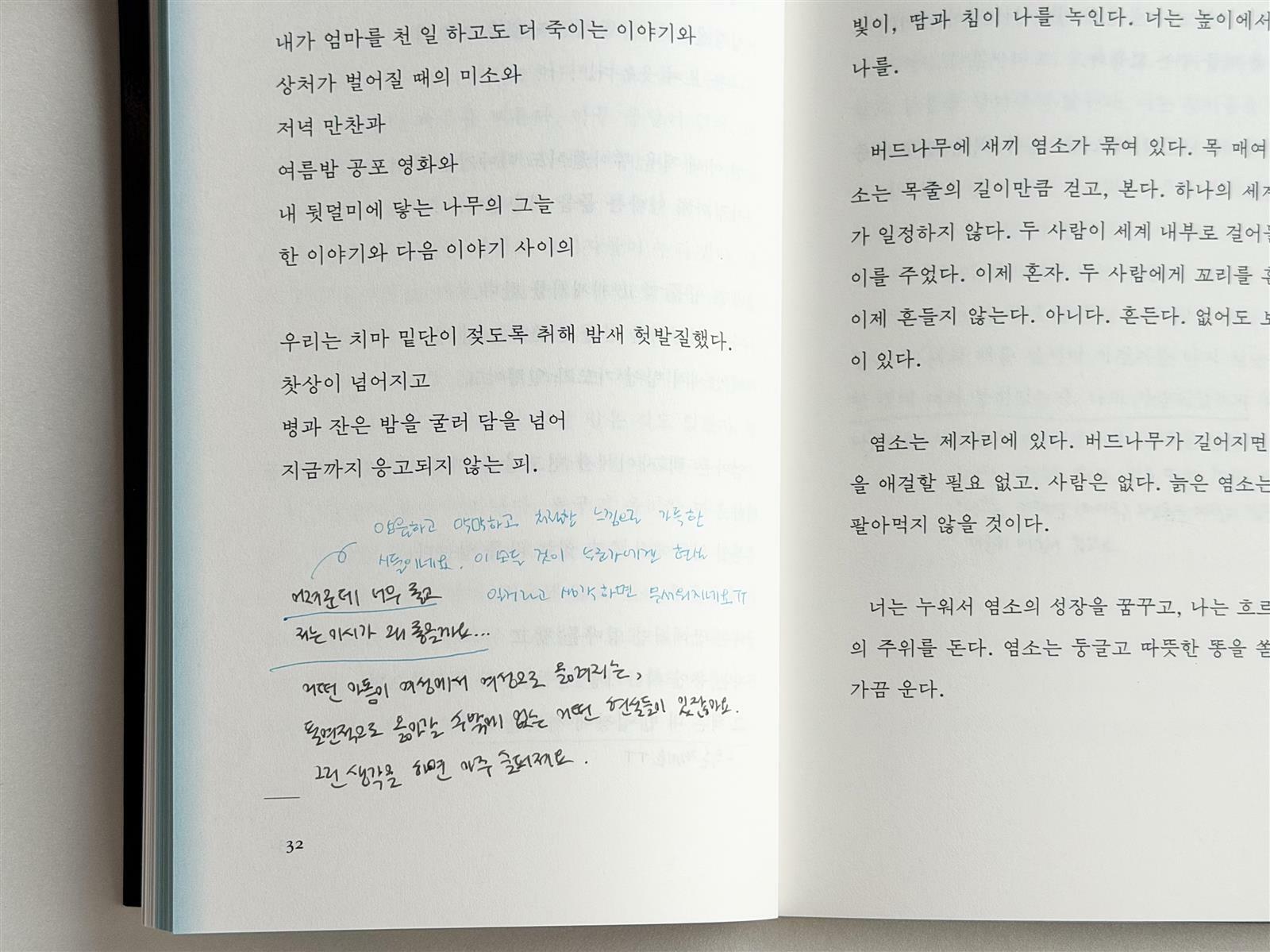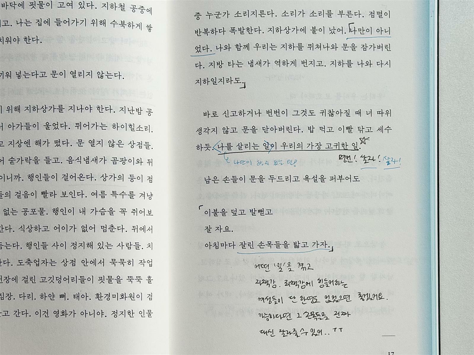 전반적으로 어둡고, 묵직한 분위기이지만, 그 중에서도 '오버타임'이라는 시는 시각적으로도 눈앞에 그려지는 듯해 오싹한 기분으로 읽었다. 시작부터 엘리베이터 바닥에 핏물이 고여 있고, 집에 들어가기 위해 수북하게 쌓인 손목들을 치워야 한다는 문장이 서두를 열고 있기 때문이다. 아침마다 잘린 손목들을 밟고 가야 하는 이유, 남은 손들이 문을 두드리고 욕설을 퍼부어도 문을 닫아버리고 스스로를 지켜야 하는 현실이 두 페이지 안에 차곡차곡 담겨 있어 무섭고, 슬픈 기분이 들었다. 누군가는 지금도 어디선가 어떤 '일'을 겪고 힘들어 하고 있을 것이다. 그들이 혼자가 아니라고 느끼게 되길, 스스로를 살리는 일이 가장 고귀하고 중요한 일이라는 것을 잊지 말길 간절히 바라며 읽었다.