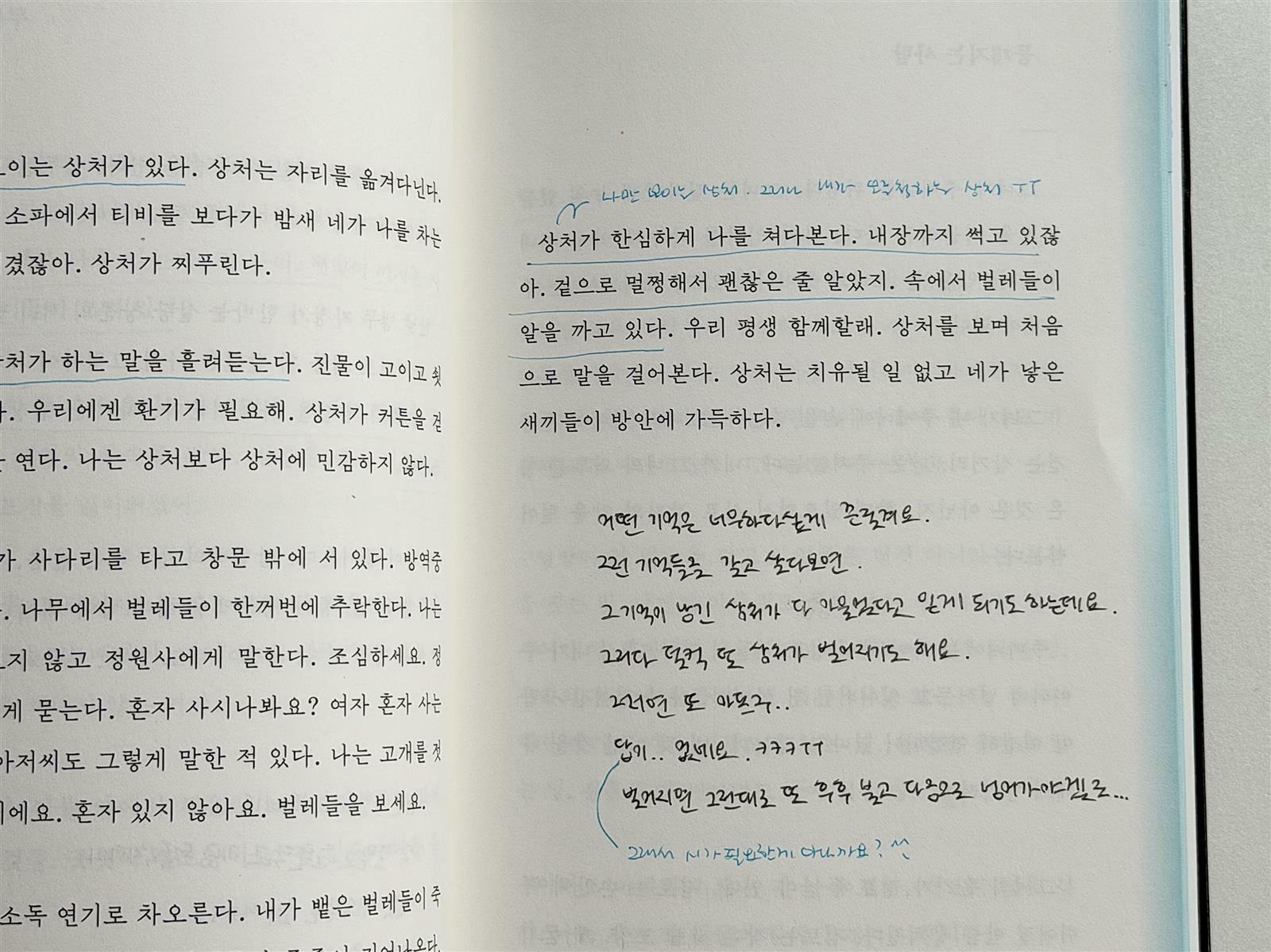내가 그랬을 리 없는데 네가 운다. 소주병을 쌓아두고 술집 구석에서. 너를 내 무릎에 눕히지 않는다. 어른이 되어서도 혼자라고. 고아라고. 너의 머리를 쓰다듬지 않고 눈물을 닦아주지 않는다. 너는 테이블을 엎고 벽을 친다. 네 상처에 약을 발라주지 않는다. 나는 반대쪽 구석 테이블에 앉아 술만 마신다. 아무도 우리를 사랑하지 않는다. - '마주침' 중에서, p.35