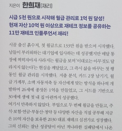 월급으로도 충분히 1억 만들 수 있다는 믿음이다. 단, 그 믿음은 요행이 아니라 꾸준함 위에 세워져 있고 부자로 만들어주겠다고 약속하지 않는다. 대신 돈 앞에서 흔들리지 않는 사람이 되도록 이끈다. 그래서 재테크 초보자에게도 이미 알고 있는 내용을 다시 확인하는 과정 속에서, 왜 그동안 실행하지 못했는지 스스로 돌아보게 만들기 때문이다.