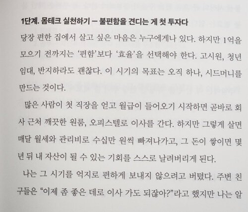 삶의 질을 포기하는 절약이 아니라, 불필요한 지출을 인식하는 절제가 필요하다는 메시지는 현실적이다. 자신의 실패 경험을 숨기지 않고 드러내며 한 번에 완벽해질 수 없다는 사실을 반복해서 강조하기에 조급해지지 않는다. 1억이라는 숫자가 목표이지만, 그 과정은 하루하루의 선택이라는 사실을 자연스럽게 받아들이게 된다. 돈 이야기를 하면서도 삶의 균형을 놓치지 않으려는 태도가 이 책 전반에 깔려 있다.