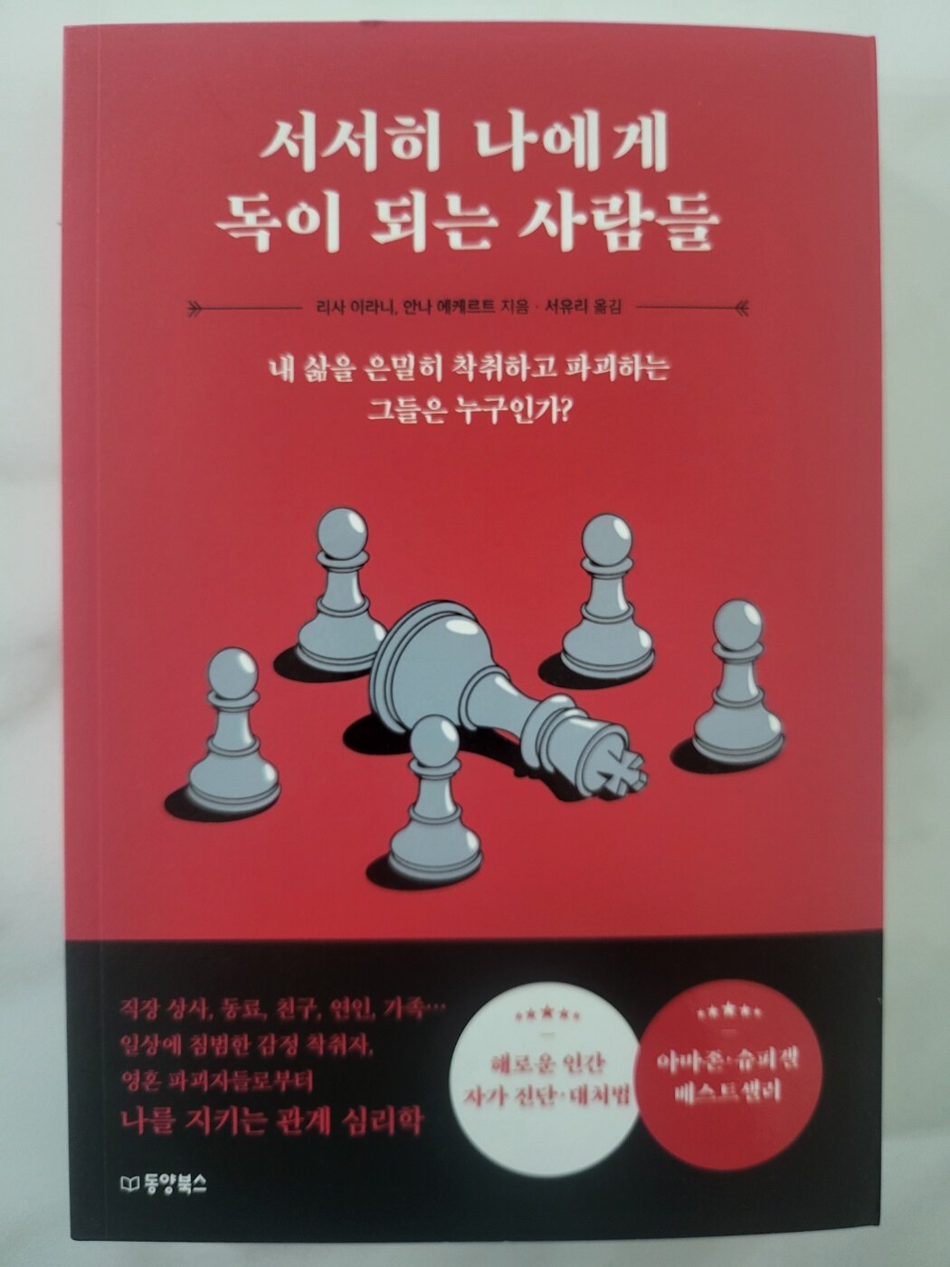 이 책은 인간관계에서 일어나는 다양한 갈등과 상처의 원인을 심도 있게 분석하고, 그로 인해 고통 받는 사람들에게 구체적인 해결책을 제시한다. 책을 다 읽은 후에는, ‘내가 불편하게 느끼는 관계에는 다 이유가 있다’는 사실을 확인하게 되었다. 나를 독에 끌어들이는 인간.관계에서 벗어나 다시 내 삶의 중심으로 돌아오고 싶은 이들에게, 이 책은 하나의 진단서이자 실질적인 회복의 길잡이가 되어줄 것이라고 믿어지기에 누구나 한 번씩 읽어보라고 추천하고 싶다