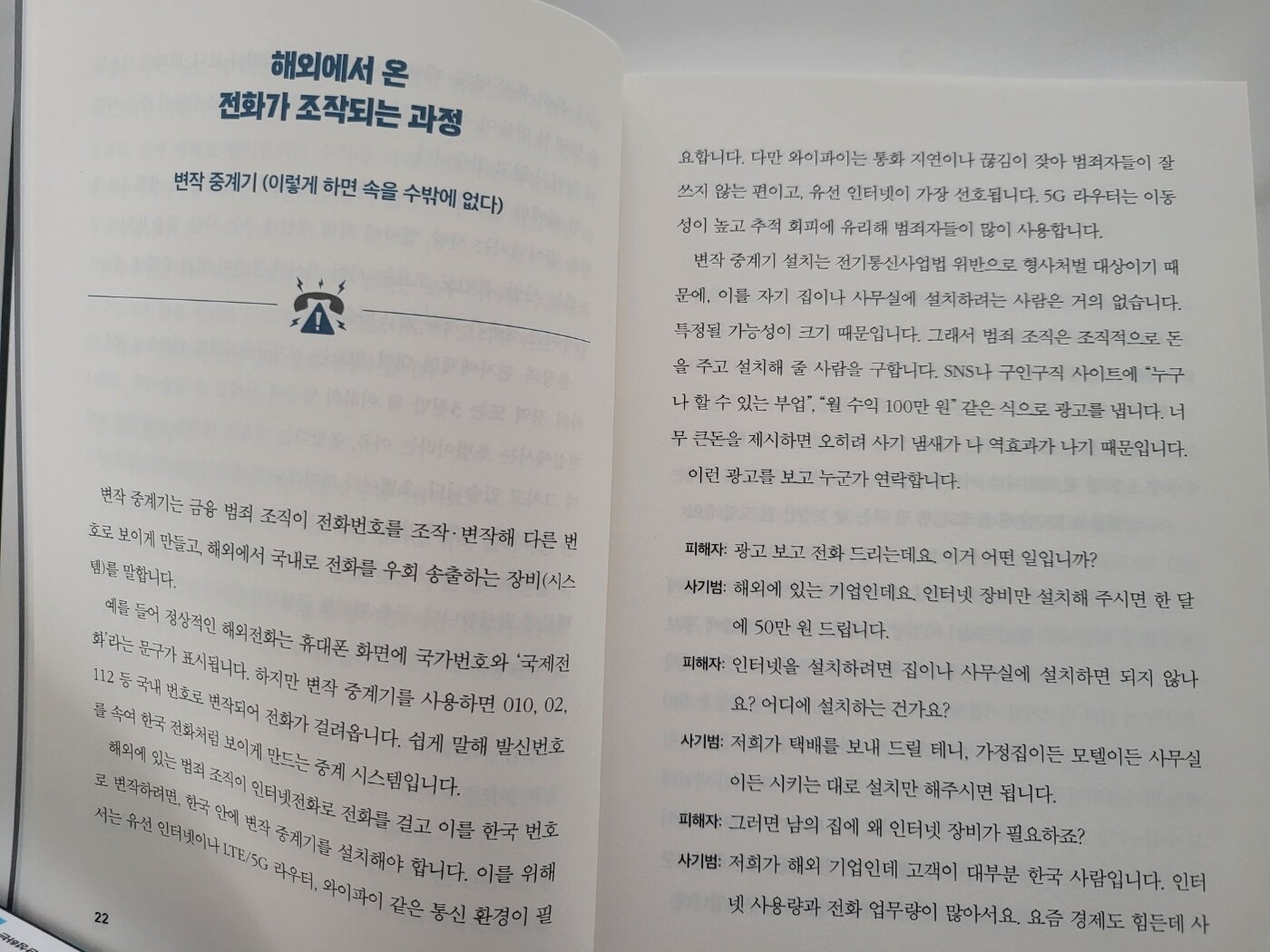 이 책에 등장하는 보이스피싱 조직들의 구조, 보이스피싱 방법, 실제 처벌을 피해가는 방법 등은 그야말로 능수능란하고 교묘하기 짝이 없다. 그들은 법을 너무도 잘 알고 있고 법망을 빠져나가는 방법 역시 아주 잘 알고 있다. 저자는 이 책을 통해 이들 조직에 대한 사실적인 묘사를 통해 현실을 꼬집으며 보이스피싱이 나날이 진화하고 있다는 점을 상세하게 밝힌다.