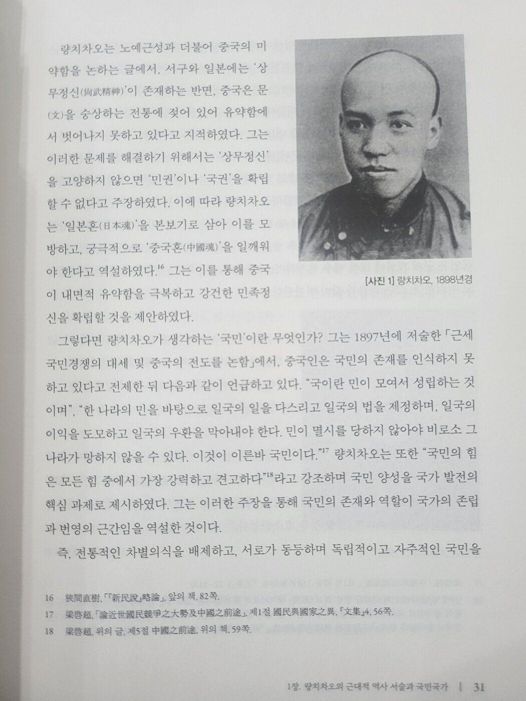 이 책에서 저자는 “량치차오는 근대 국민국가를 건설하는 데 있어 역사의 주체로서 민족을 부각시켰다.”고 하면서 “그가 구상한 ‘대민족주의’는 혈통, 언어, 풍속과 같은 객관적 요소를 초월해서 “나는 중국인이다” 혹은 “나는 중화민족의 일원이다”라고 스스로 자각하는 ‘민족의식’의 발현을 통해 구현되는 근대적 의미의 민족관념을 제기하였다“(p.49)고 말했다.