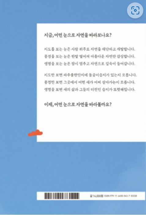 책의 마지막 장을 덮고 다시 차례로 돌아가 뒤에서부터 되짚는다. ‘나는 왜 새를 보는가’, ……, 왜냐하면, ‘생명을 보는 눈 되기’. 생명을 보는 눈으로 새를 보자는, 새 이야기인 줄만 알았던 책이 다른 얼굴로 나를 바라본다. 글쓴이가 새를 보는 까닭은자기를 비롯한 생명을 보는 눈에 머무르기 위해서다. 미래가 암울한 세상 속에서 절망에 주저앉거나 체념하지 않고 생명을 보는 눈에 머무르기 위해, 글쓴이는 오늘도 새를 본다. 그리고 하루도 빠짐없이 새 이야기를 SNS에 올리고, 달마다 글쓰기 회보에 쓰고, 이렇게 책도 펴냈다.