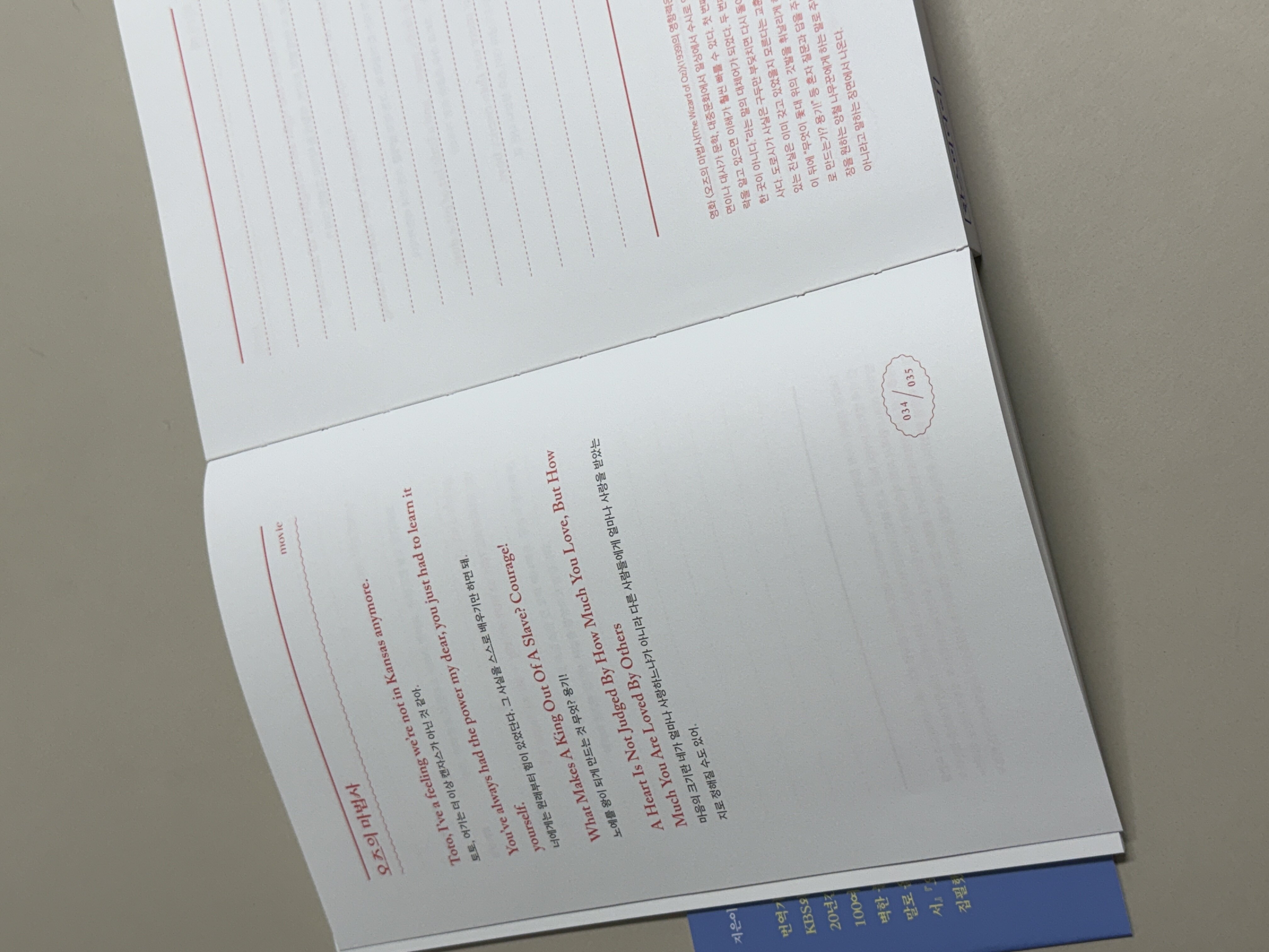 그런 와중에 이 책은 왼쪽 편에는 소개하는 문장들과 함께 번역이 함께 있고 오른 쪽에는 필사할 수 있는 공간과 하단에는 왼쪽 편의 해당 문장에 관한 정보들이나 몰랐던 비하인드를 있어 또 하나의 독서 아닌 독서를 하는 것 같았다. 그리고 베테랑 번역가 노지양 님께서 무려 150여 편의 고전소설 만이 아닌 시, 영화, 편지, 연설, 일기 등 다양한 분야에서의 영어 문장들을 소개해 주셨다고 한다. 이게 다 번역가님도 덕후의 기질이 있으셔서 여러 부류에서 다양하게 아름답고 좋은 문장들을 엄선해 주실 수 있었다고 한다. 이것저것에 흥미를 갖는 나 같은 사람은 이런 다양한 분야에서의 좋은 문장들을 손쉽게 만나고 또 필사도 할 수 있는 기회가 주어지다니 감사할 뿐이다.