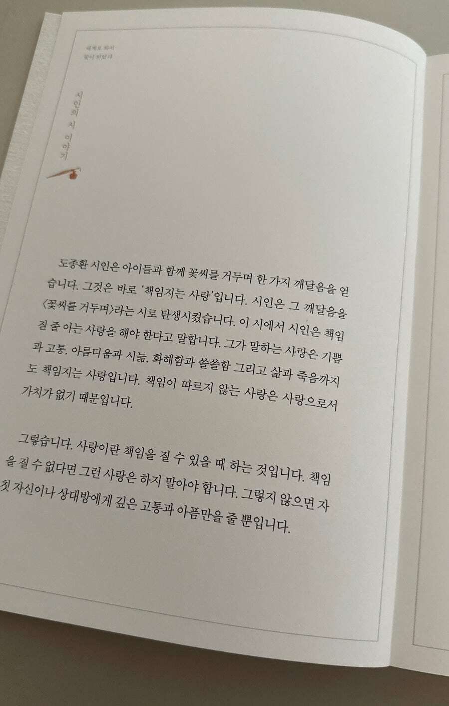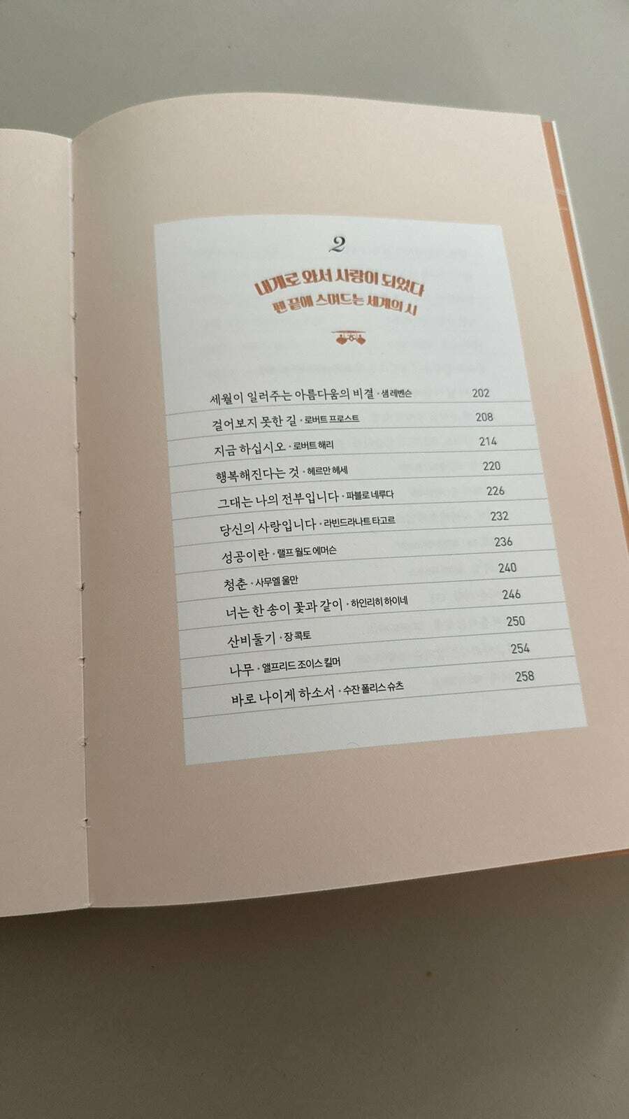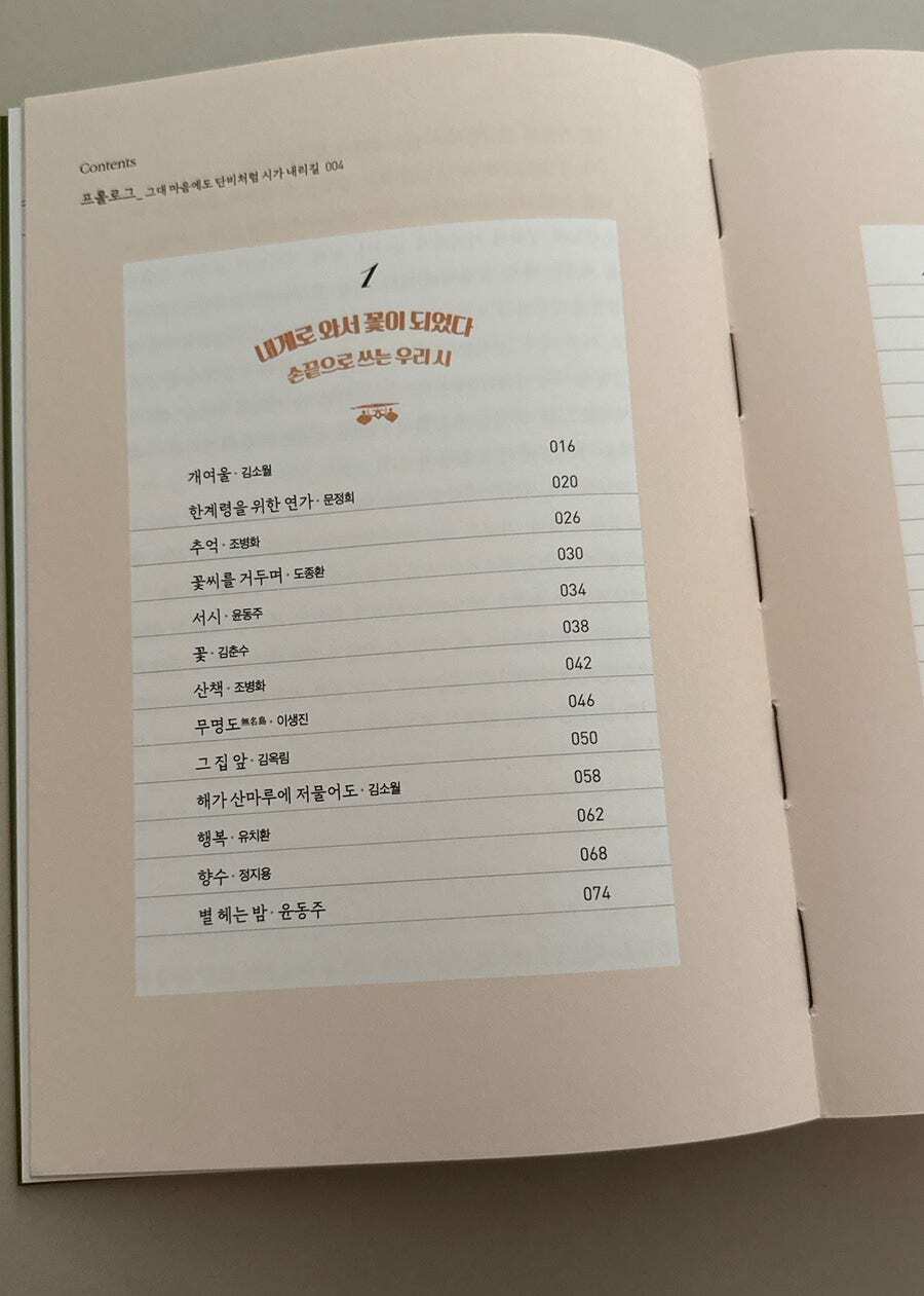 이 책은 두 개의 챕터로 첫 번째는 국내의 시, 두 번째는 해외의 시들이 다루어져 있는데 익히 들어본 시도 있고 시는 처음이라도 익숙한 이름도 볼 수 있었다. 그리고 아무리 쉽게 읽히는 시라도 설명이 있었으면 했는데 이 시를 엄선해서 담아주신 김옥림 시인님의 시와 시인에 대한 이야기들도 함께 다루어져 있어서 옛말 같은 느낌이 들어 약간 어색한 기분이 드는 시들도 어떤 마음으로 받아들여야 하는지 배우기도 하는 기분이 들어 제대로 시를 읽을 수 있게 해주었다. 이 책도 어느 장을 펴도 넘김 없이 볼 수 있게 사철누드제본으로 되어 있어서 어느 페이지든 편하게 펼쳐 볼 수 있고 필사에도 편하다.