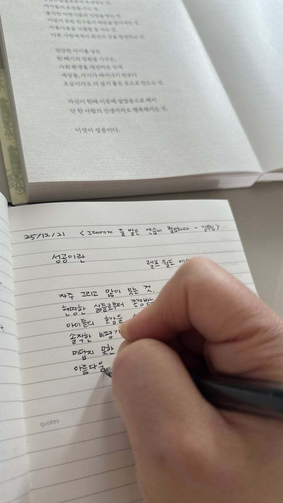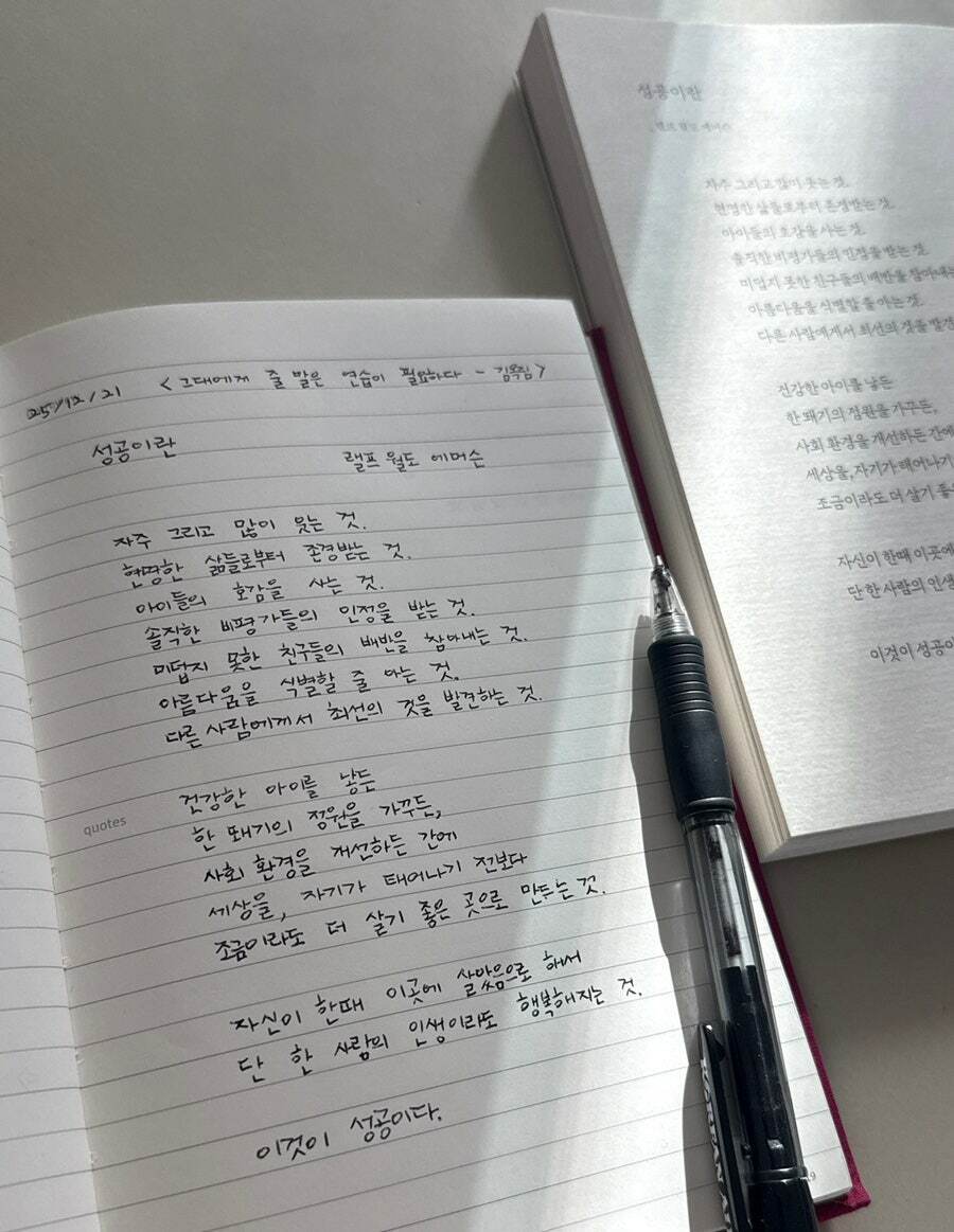 처음 페이지를 무작정 넘겨보다가 멈춘 페이지는 ‘성공이란‘ 제목의 시였다. 옛날에도 요즘처럼 성공이 중요한 가보구나 어떤 부분의 성공일까 궁금하기도, 또 일반적인 뻔한 성공에 대한 이야기인가 하며 반감이 들기도 했는데 시를 읽어 내려가면서는 시 한 구절 한 구절에 감동받고 앞으로 나이 들면서 나도 이런 삶으로 살아가고 싶다는 마음이 들게 한 너무 좋은 시였다.