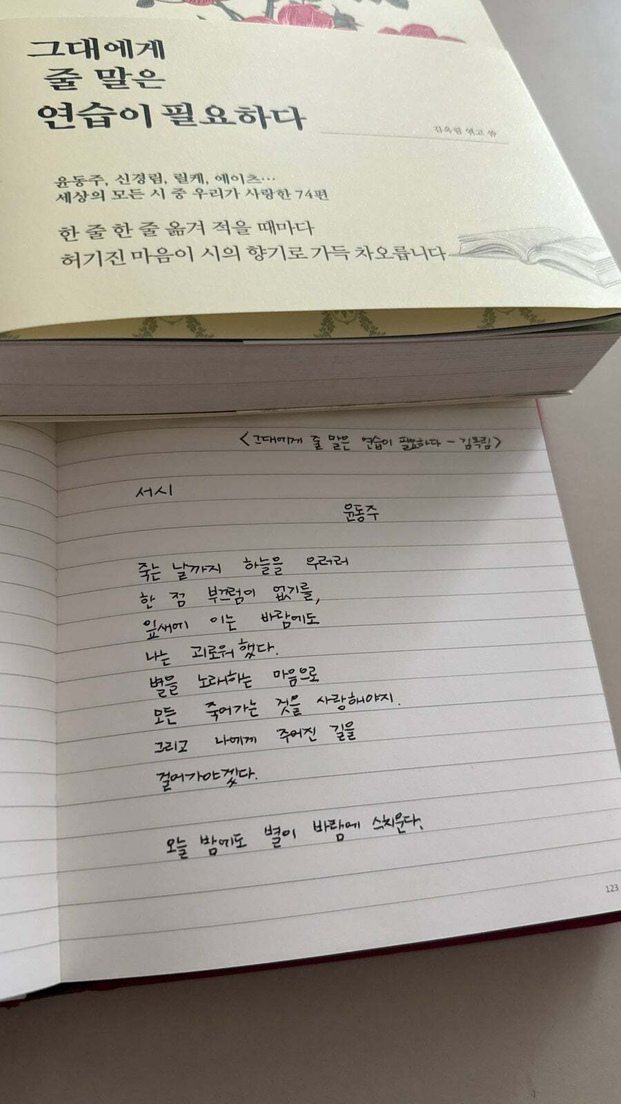 나와 비슷한 시기의 학창 시절을 보낸 분들이라면 알아서 서시 하면서 나도 모르게 입에서 저절로 외워지는 시이기도 하지만 적어 내려갈 때의 묵직함은 또 다른 기분을 느끼게 해주었다. 오래되긴 했지만 영화 ‘동주’의 흑백 화면의 영상들도 머릿속에 맴돌아 그 묵직함과 먹먹함이 온전히 전해오는 느낌이었다.