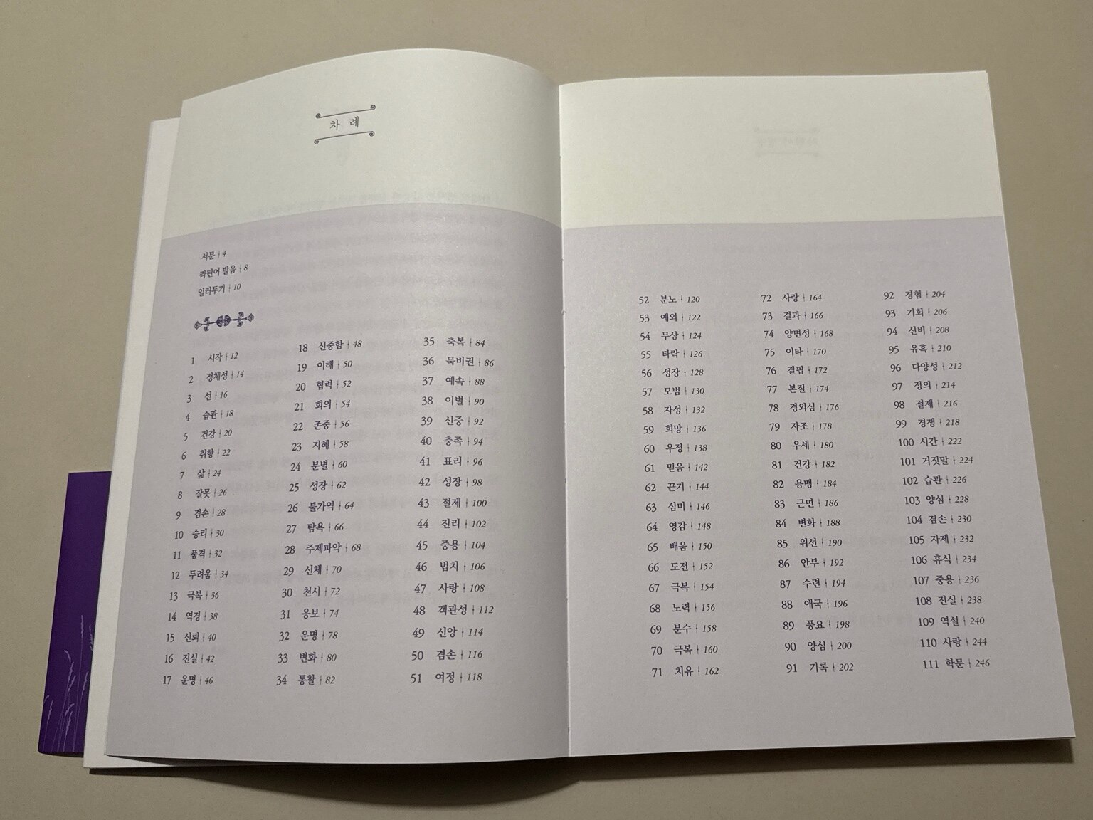 라틴어에 대한 생소한 느낌이 없지 않지만 얼마 전에 스페인어를 배운다는 지인이 얼마나 아름다운 표현들이 많은지 또 배우기도 쉽다는 말에 흥미가 있던 중이기도 했다. 그 와중에 ‘산초 티처의 111라틴어 필사집’을 만나게 되었는데 나의 생각이 틀리지 않았음을 알게 해주는 좋은 글들이 이 책에도 111가지나 들어 있었다. 동시대를 막론하고 종교적인 부분을 떠나고서라도 성경이나 속담 전해오는 이야기들을 그저 읽어 내려가는 게 아니라 한 글자 한 글자 천천히 적어 내려감으로써 알지 못하는 언어의 세계 속에서도 통하는 이야기들을 알게 되면 그 이야기가 전혀 다른 세상이 아니고 결국 사람 사는 건 다 똑같구나를 느꼈다. 이 책 역시도 사철누드제본으로 되어 있어 어느 페이지든 넘어가지 않고 잘 펼쳐져 있고 뜯김 걱정은 말할 것도 없이 튼튼하게 되어있다. 목차에는 111가지의 단어로 되어있어서 차례대로 따라가기도 좋고 나처럼 단어를 보고 눈에 들어오는 페이지를 펼쳐 적어도 좋을 것 같다. 중복되는 단어도 있지만 페이지마다 그 단어에 관련된 문장은 달라서 또 한 번 다른 생각으로 맞이하는 즐거움도 있다.
