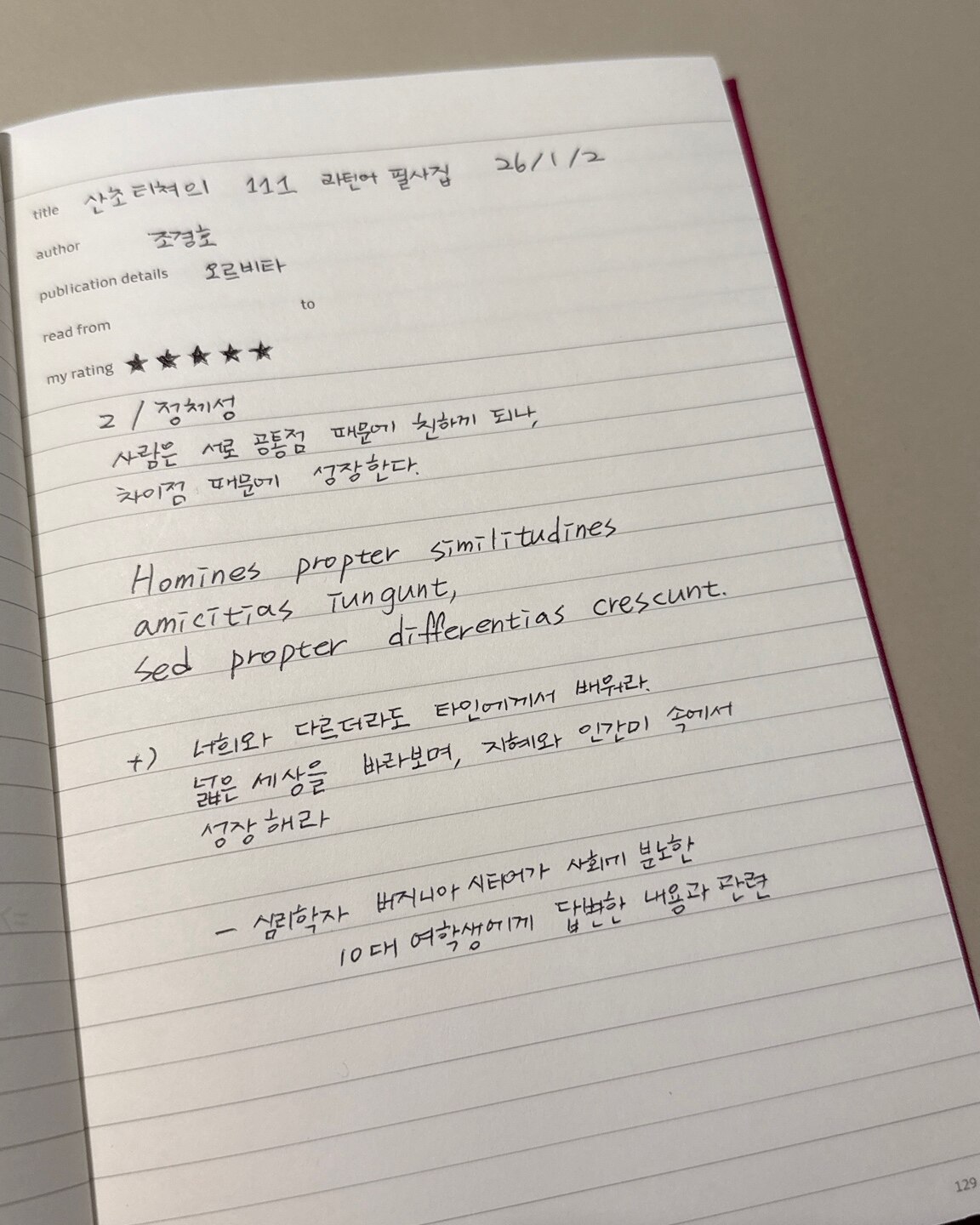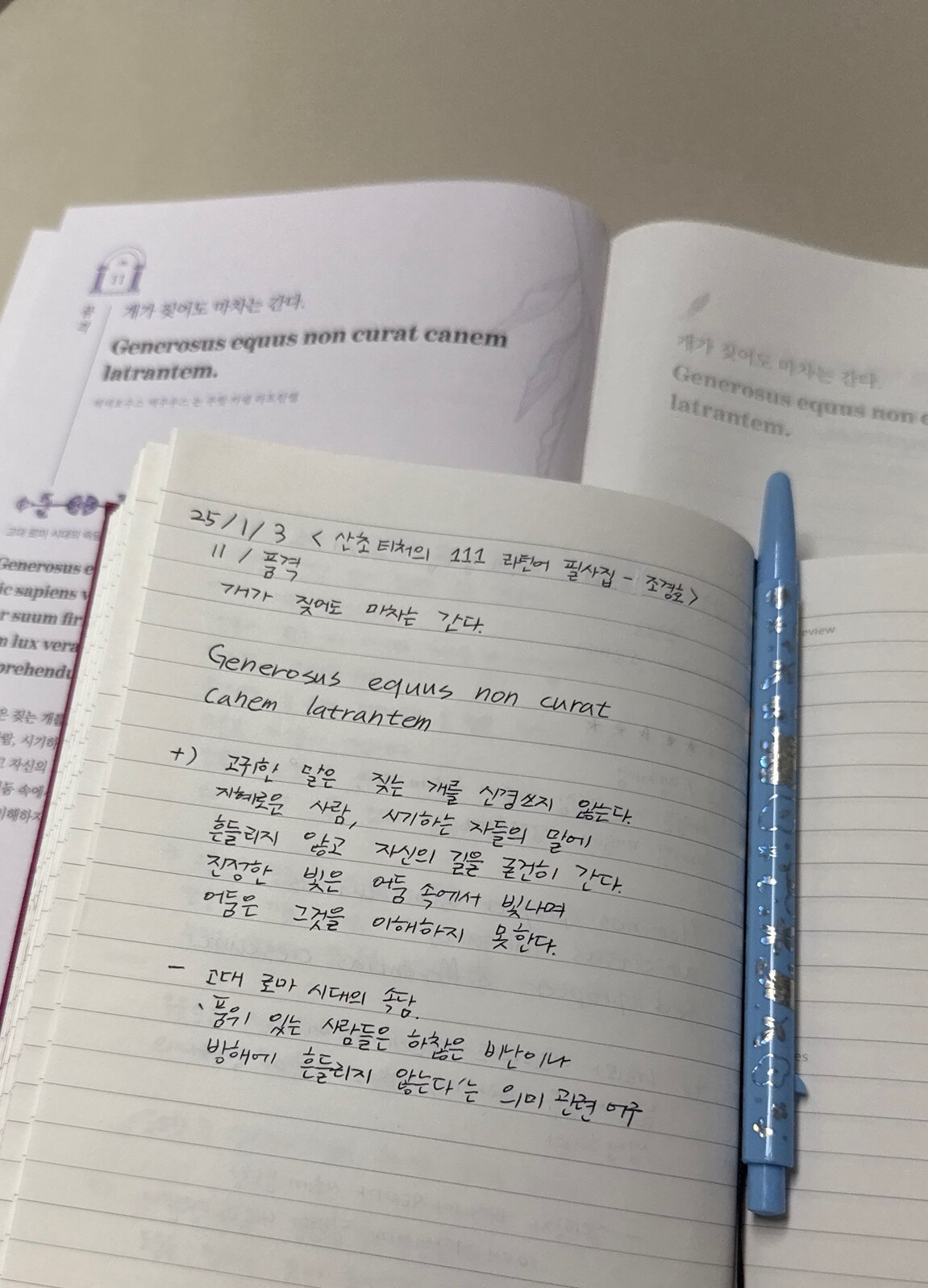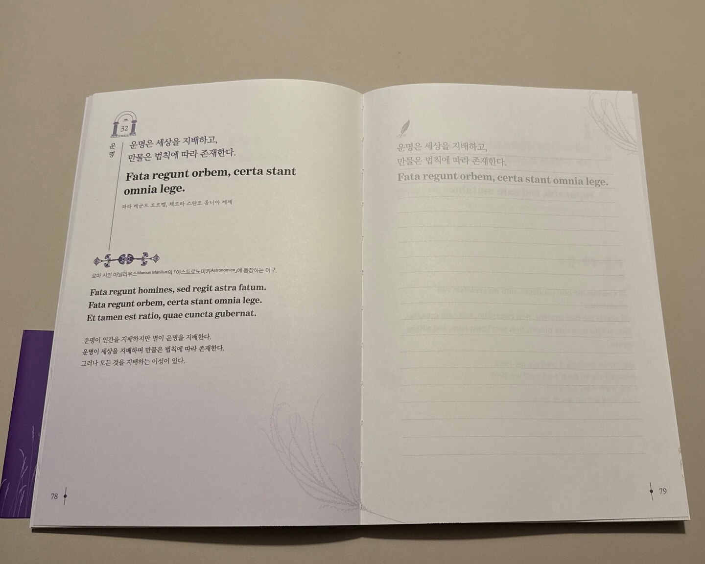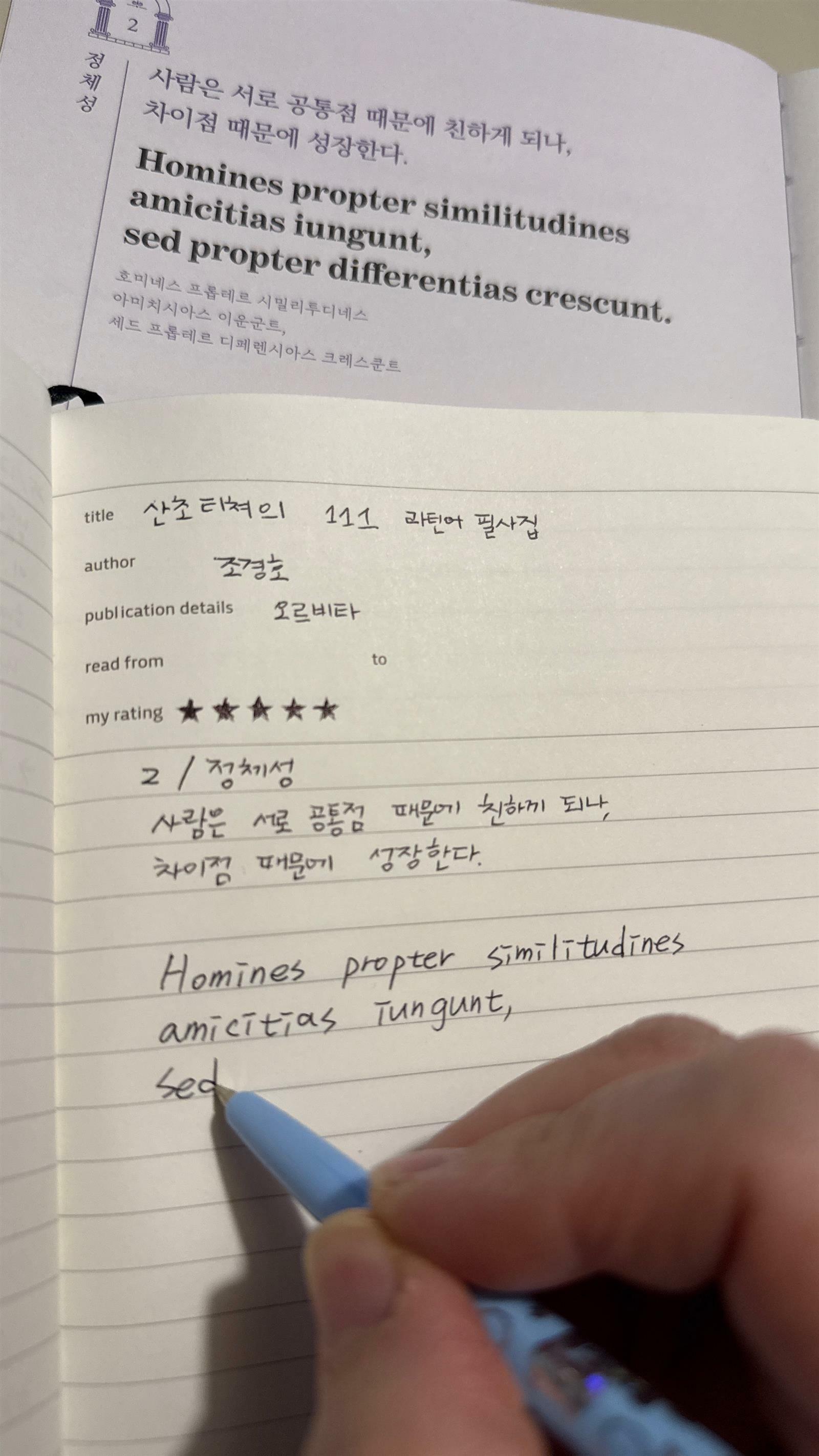 한글도 아직은 익숙하지 않은 라틴어도 한 글자 한 글자 빠르게 따라 적어 내려가는 것보다 그 의미를 되새기며 천천히 음식을 음미하듯 적어가면서 마음에 담는다면 그 의미가 또 나만의 의미로 거듭날 수 있는 좋은 필사가 될 것 같다.