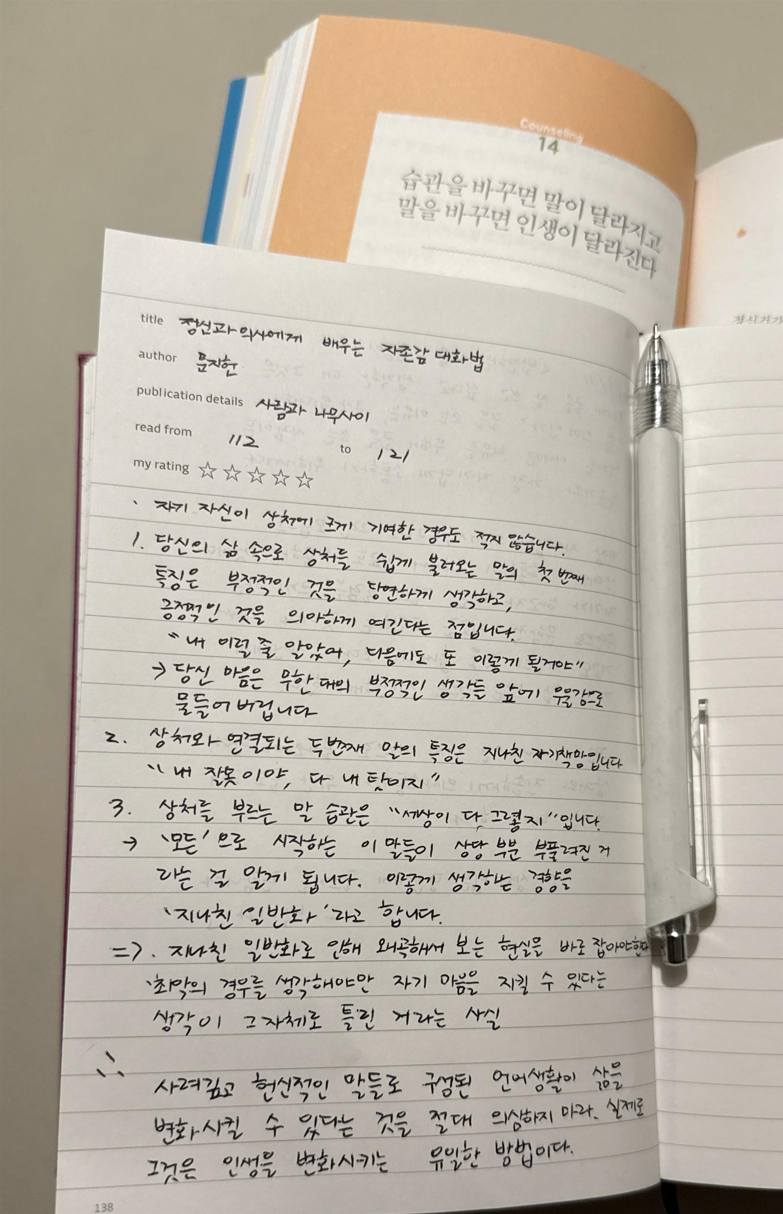 ‘잘될 거야, 괜찮아, 힘내’ 이런 긍정적인 말이 때로는 더 상처가 되고 납득이 되지 않을 때도 있는데 이 책은 그런 부분도 당연한 이유가 있어서라고 이야기해주니 그게 오히려 나에겐 위로가 되었다. 그리고 읽으면서 내 입장으로 생각하면 여전히 내 탓을 하고 있을 걸 누군가가 저렇게 생각한다고 하니 너무 안타깝다 여기기는 했는데 필사를 한 글자 한 글자 적어 내려가면서는 어느 순간 그 안타까운 사람이 바로 나여서 내가 왜 그렇게까지 나를 책망하고 채찍질하며 돌보지 않는 건가 싶은 의문이 들었다. 그러면서 나의 마음은 그때 어땠을까. 그리고 이 책을 읽는 지금은 어떤 마음으로 흘러가는 걸까라는 막연하지만 나의 마음을 묻는 궁금증이 나를 향해 들려왔다. 그 와중에 계속 읽어 내려가니 정말 상대방과의 대화 속에서 가장 먼저 알아야 할 것이 나의 마음과 나의 감정과 생각의 차이를 얘기해 주시는 페이지에 놀랐다. 아 나는 나를 원망하고 자책만 했지 왜 그런 마음이 들었는지를 살피지 못했구나.. 정말 너무 당연한 얘기 같으면서도 전혀 접하지 않았던 나에 대한 보살핌이었다. 그로 인해 타인과의 대화에서도 타인만 생각하고 나의 생각은 내 스스로가 묵살하고 그냥 받아주는데 너무 길들여져 있어서 더 나의 마음을 알려고 한다면서 찾을 수가 없는 것이었다.