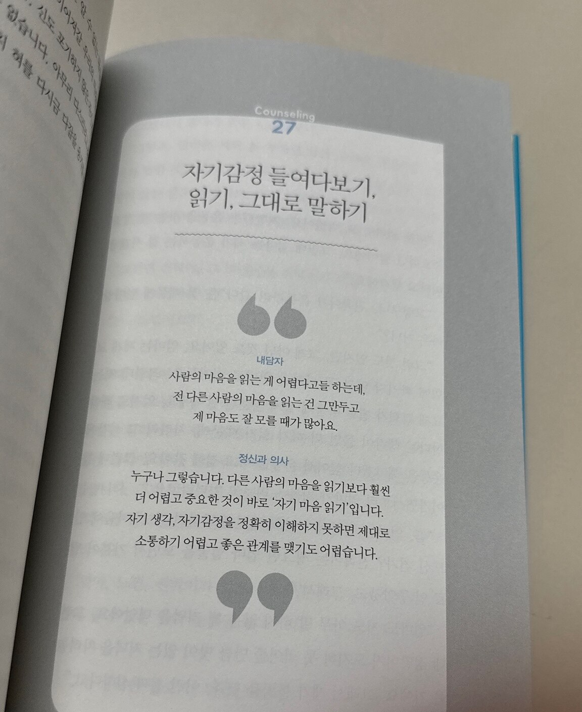 제목 그대로 10년 넘게 정신건강 전문의로서 병원을 운영하고 계시는 문지현 선생님께서 만드신 책으로 내담자의 마음이나 궁금증을 통해 의사로서 조언을 해주면서 챕터들이 이루어져 있고 챕터마다 그와 관련된 이야기들이 좀 더 구체적이고 깊이 있게 주제에 대해 다루어져 있었다.