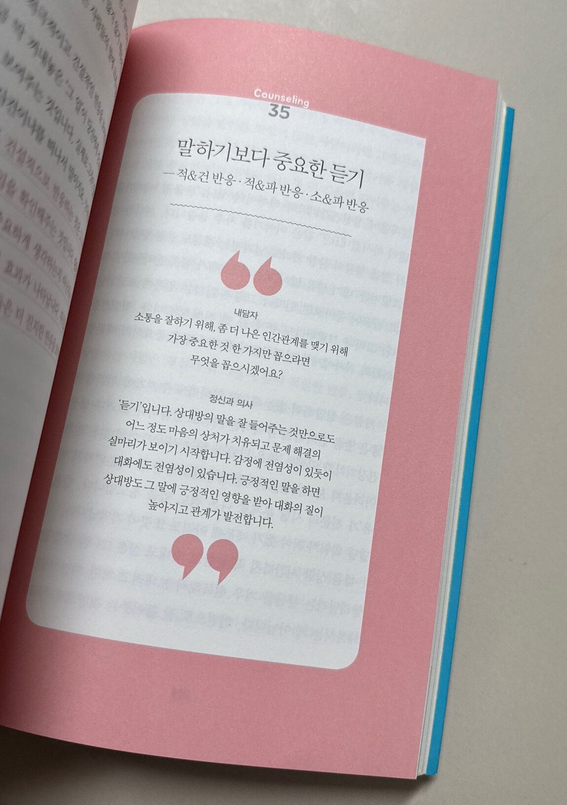 나는 늘 조금 더 나를 존중하고 이해할 수 있게 돼서 지금보다 더 나은 나로, 엄마로, 아내로, 친구가 되어가고자 독서를 꾸준히 또 많이 하려고 현재도 노력 중이다. 그런 와중에 이 책은 나의 본질적인 문제의 마음속을 마치 내 옆에 붙어 지켜본 것처럼 표현해 주는 페이지가 있었다. 너무 놀랍기도 했지만 또 다른 한 편으로 생각해 보면 그런 나의 모습이 비단 나뿐만이 아니라 많은 이들이 범하고 있는 오류라서 정리돼있는 것으로 생각된다. 바로 희망적이고 방법론적인 부분으로 문제점을 짚어 이렇게 말하세요라고 알려줄 수도 있지만 지금 내가 하는 이 행동이, 이 언행이 어떻게 해서 잘못된 거고 그 잘못은 어떤 과정들을 통해 만들어지고 견고해졌는지를 알려주는 대목이었다. 그로서 그것이 계속되었을 때의 좋지 않은 점을 이야기해 주는 것이 내겐 참 인상 깊었다.