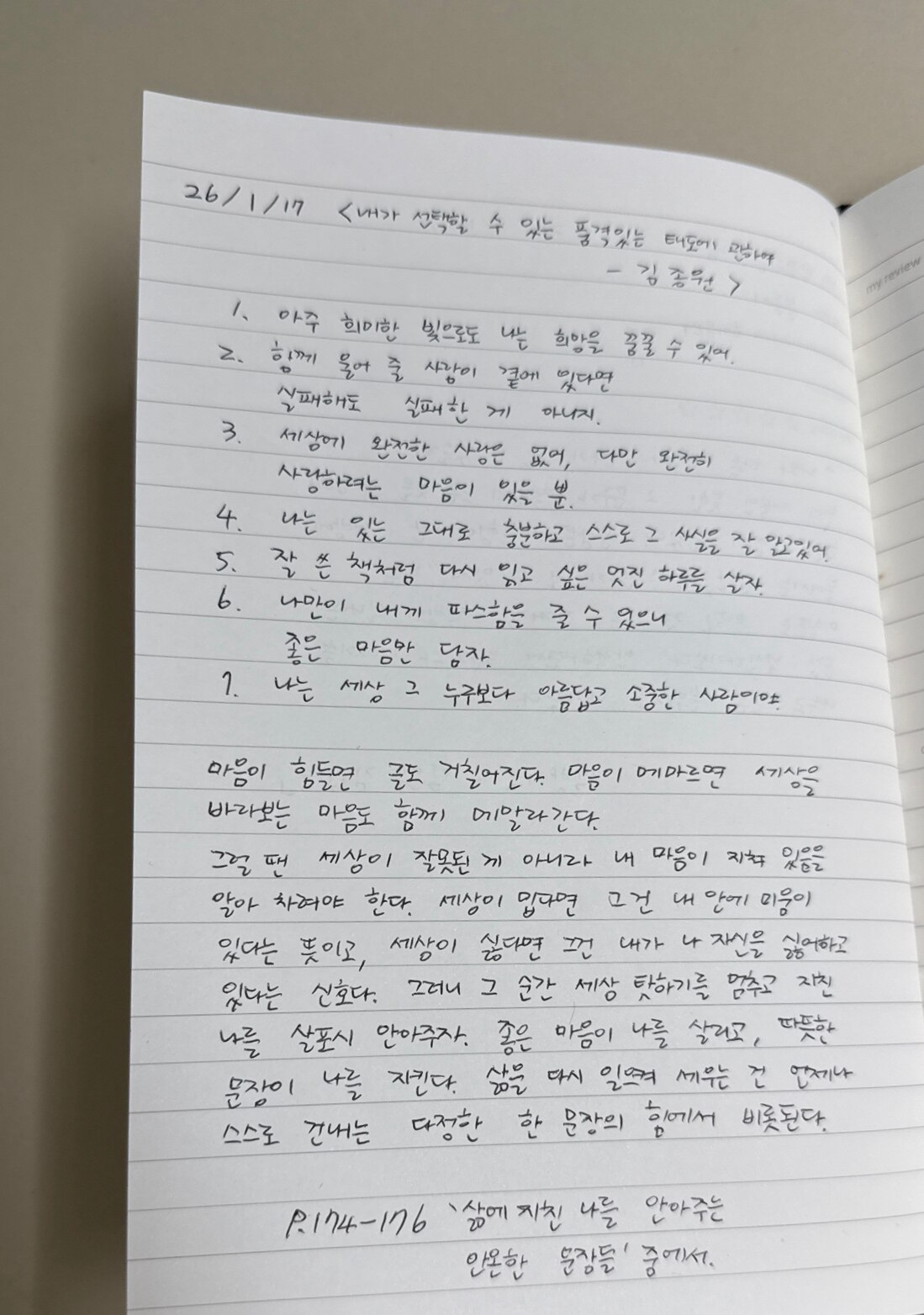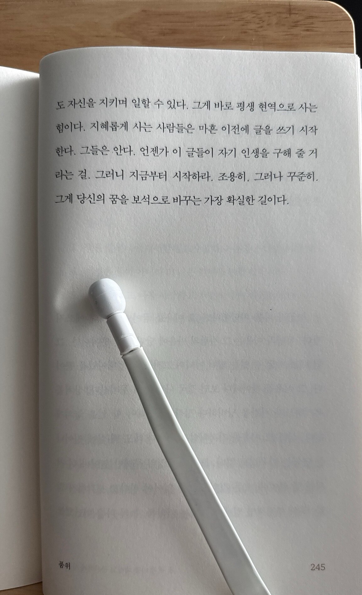 이제는 어느덧 40대가 되어 어렴풋이 이게 맞는 건가, 어떻게 앞으로는 살아가야 하는 건가에 대한 고민도 없이 그냥 하루하루를 보내는 와중에 그럼에도 독서와 필사, sns를 통한 글쓰기는 시작했다. 그리고 이 행위들이 평생 살아가면서 갖고 가길 바라는 나의 당연한 일상이 되어가려고 노력 중이다. 하지만 이것이 과연 팍팍하고 힘든 삶 속의 누군가에게는 내가 마치 신선놀음 같은 일인가도 싶게 묘한 죄책감도 있던 게 사실이다. 나는 뭐든지 내 주변이 아니라도 더 넓게라도 모든 걸 내 탓을 하는 게 너무 당연한 듯 살아왔기 때문이었다. 하지만 이 책을 읽으면서 무엇이든 나로부터 시작해야 한다는 점을 깨달았다. 그리고 그것은 더 나아가 세상을 살아가는데 이바지하는데 내 스스로가 제대로 해나갈 수 있게 하는 태도였음을 이 책을 통해 배웠다. 고작 내가..였던 그 마음이 책을 다 읽고 덮으면서는 나도 어쩌면 이는 기대감을 불러일으켜 주었다. 그리고 그런 마음들을 갖게 해주는 수많은 페이지들이 있었는데 그중에 가장 시선이 닿은 부분을 필사해 보았다. 작가님의 말씀대로면 글쓰기, 필사는 생각지 못하게 하고 있는 터라 내심 나 지금 잘 살아내려고 하는 거구나 하면서 한 글자 한 글자 꾹꾹 눌러 담았다.