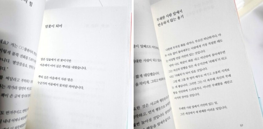 누군가의 입술에서 피어난 한 마디의 말이 상대방의 마음 깊이 스며들어 향기로 스며들 때 말은 꽃처럼 피어난다는 아름다운 표현이 우리가 말을 입에서 꺼낼때 생각없이 뱉어내는 행위에 대해 반성하기도했고 말의 무게에 대해 다시 생각해 보는 계기가 되었다. 같은 말이라도 내가 어떻게 표현하느냐에 따라 말을 듣는 상대는 풀밭이 온통 꽃밭이 될수도 있다는 작가의 생각대로 말이다.