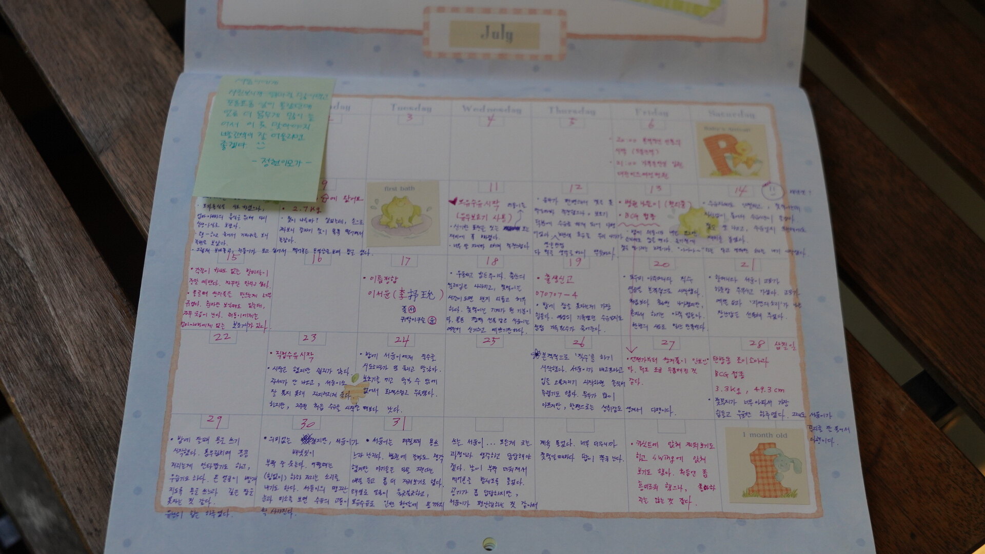 그런데, 매일 손글씨로 썼던 메모장의 '수유 일지'에는 나의 힘듦, 불안함 등이 고스란히 기록되어 있었다. '우울하고 힘든주이다', '젖먹이는 기계가 된 기분이다', '좌절스럽고 우울했다', '가장 힘들고 우울한 하루였다', '유난히 힘든 하루였다', '땀이 쭈욱 난다', '집안은 엉망. 물한잔 먹을 새도, 화장실 갈 틈도 없다', '안아줘야 겨우 잠든다', '다리는 붓고 몸이 내몸 같지 않았다', '즐기면서 성공하자, 즐기면서 성공하자, 즐기면서 성공하자', '1401호 엄마, 00엄마, 아내, 며느리로 살지 말자. 내 이름 000, 000, 000', '그냥 욕 먹고 말자, 언제나 나는 옳다!' 등등 이 적혀 있었다. 그저 나오는대로 쏟아낸 나의 진실의 말들.