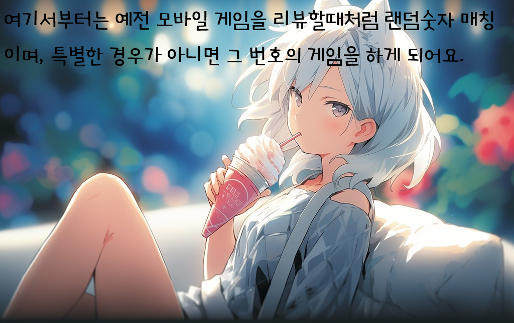 이 게임부터는 과거 모바일 게임을 리뷰했을때처럼 리뷰할 게임(스팀 무료 게임을 의미함)리스트에서 게임 제목을 가나다 순으로 작성하고 숫자를 뽑아서 나온 숫자와 매칭되는 게임을 하게 되는데, 처음에는 제가 하고픈 게임을 선택했고, 그 다음에는 숫자를 선택하고 관심없는 게임은 건너뛰고 그 숫자 뒤로부터 싫은 느낌은 안나는 게임을 선택해서 했어요. 여기에는 좋아해서 선택하고픈 느낌이 없더라도 싫은 느낌만 없으면 선택했어요. 이 게임 부터는 특별한 경우. 성인용 게임(여기서는 선정적인 게임을 의미함)이거나 도박 게임(어드벤처 게임에 도박 요소가 있는 게임은 제외)이 아니라면 별로일것 같은 게임도 리뷰하게 되어요. 리뷰어가 게임을 골라가면서 리뷰할수는 없으니까요. 단 100% 할인게임은 랜덤으로 숫자를 뽑아서 하는 게임보다는 우선이고, 이 게임들은 숫자를 안 뽑고 그냥 선정해서 하여요.