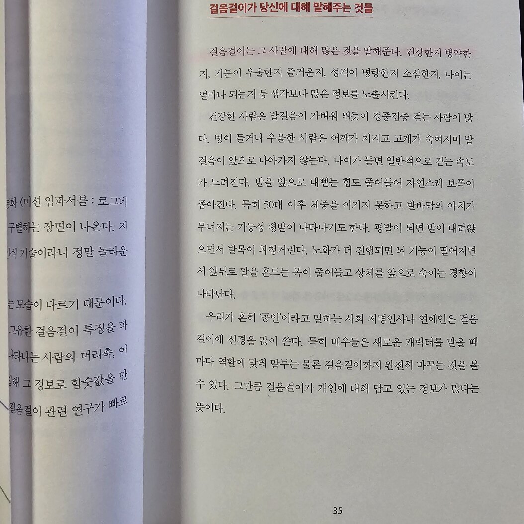 걸음걸이는 그 사람에 대해 많은 것을 말해준다. 건강한지 병약한지, 기분이 우울한지 즐거운지, 성격이 명랑한지 소심한지, 나이는 얼마나 되는지 등 생각보다 많은 정보를 노출시킨다.