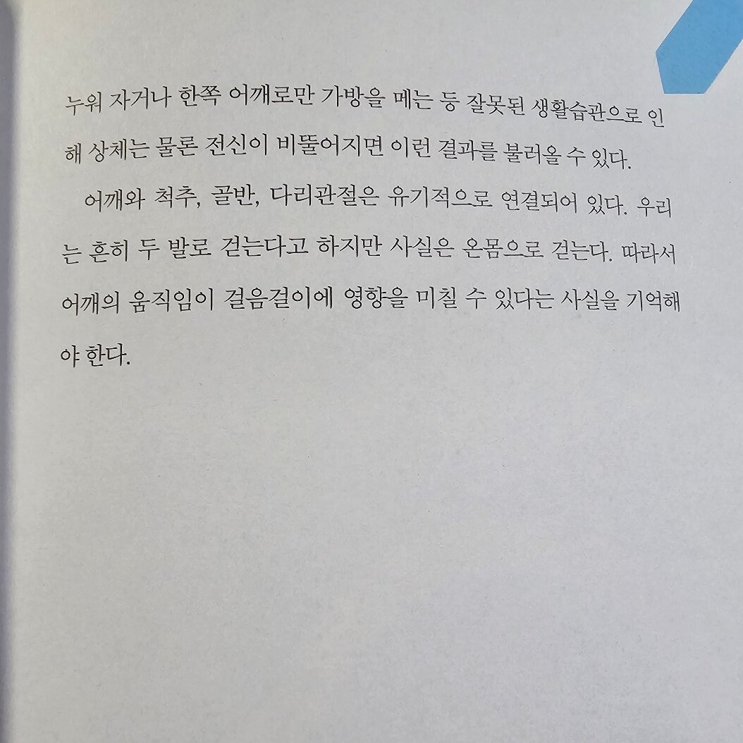 어깨와 척추, 골반, 다리관절은 유기적으로 연결되어 있다. 우리는 흔히 두 발로 걷는다고 하지만 사실은 온몸으로 걷는다. 따라서 어깨의 움직임이 걸음걸이에 영향을 미칠 수 있다는 사실을 기억해야 한다.