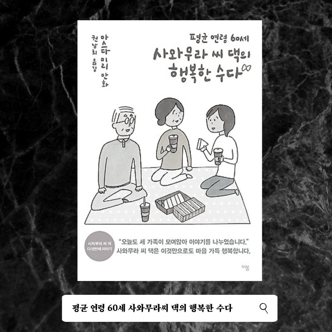<평균 연령 60세 사와무라 씨 댁의 행복한 수다>는 제목 그대로다. 사와무라 씨와 부모님이 한 지붕 밑에서 살며 일어나는 에피소드를 두장 남짓한 페이지에 실은 만화다. 매일 같이 부모님과의 대화를 통해서 사와무라 씨가 깨달은 것들, 사와무라 씨의 말과 삶을 통해 부모님이 깨달은 것들을 다룬 이 책은 한 장 한 장 넘길 때마다 아깝다는 생각이 든다. 말 그대로 힐링 그 자체를 안겨주기 때문이다.