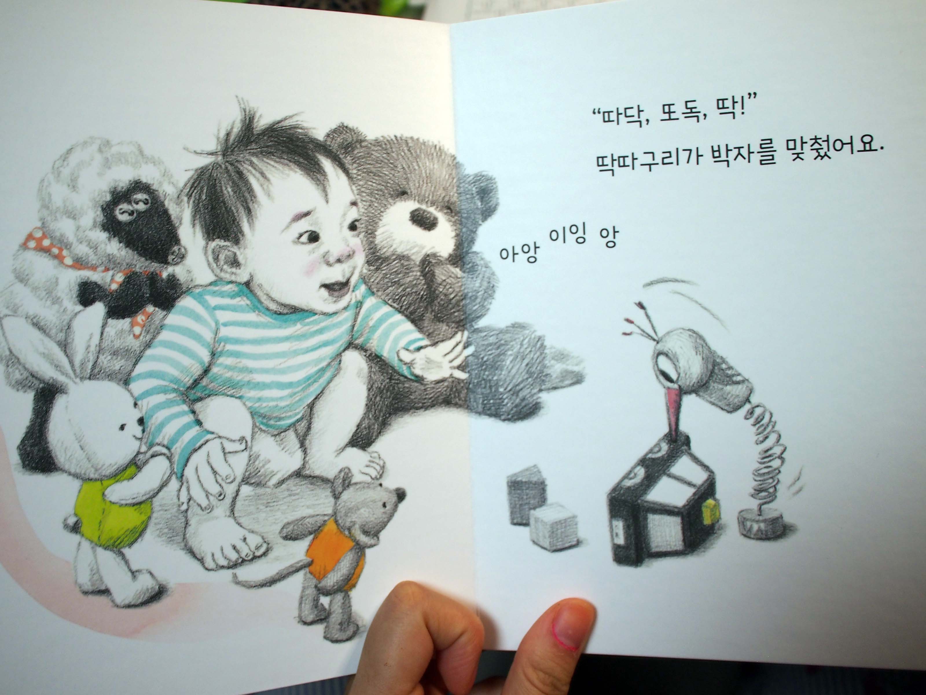 해인이가 왜 우는지는 아무도 모르지만, 어떻게 하면 해인이를 다시 방긋 방긋 웃게 할 수 있을지는 아는 것 같아요. 토끼 인형, 곰 인형, 양 인형, 그리고 이런저런 장난감 친구들이 해인이의 기분을 달래줍니다!