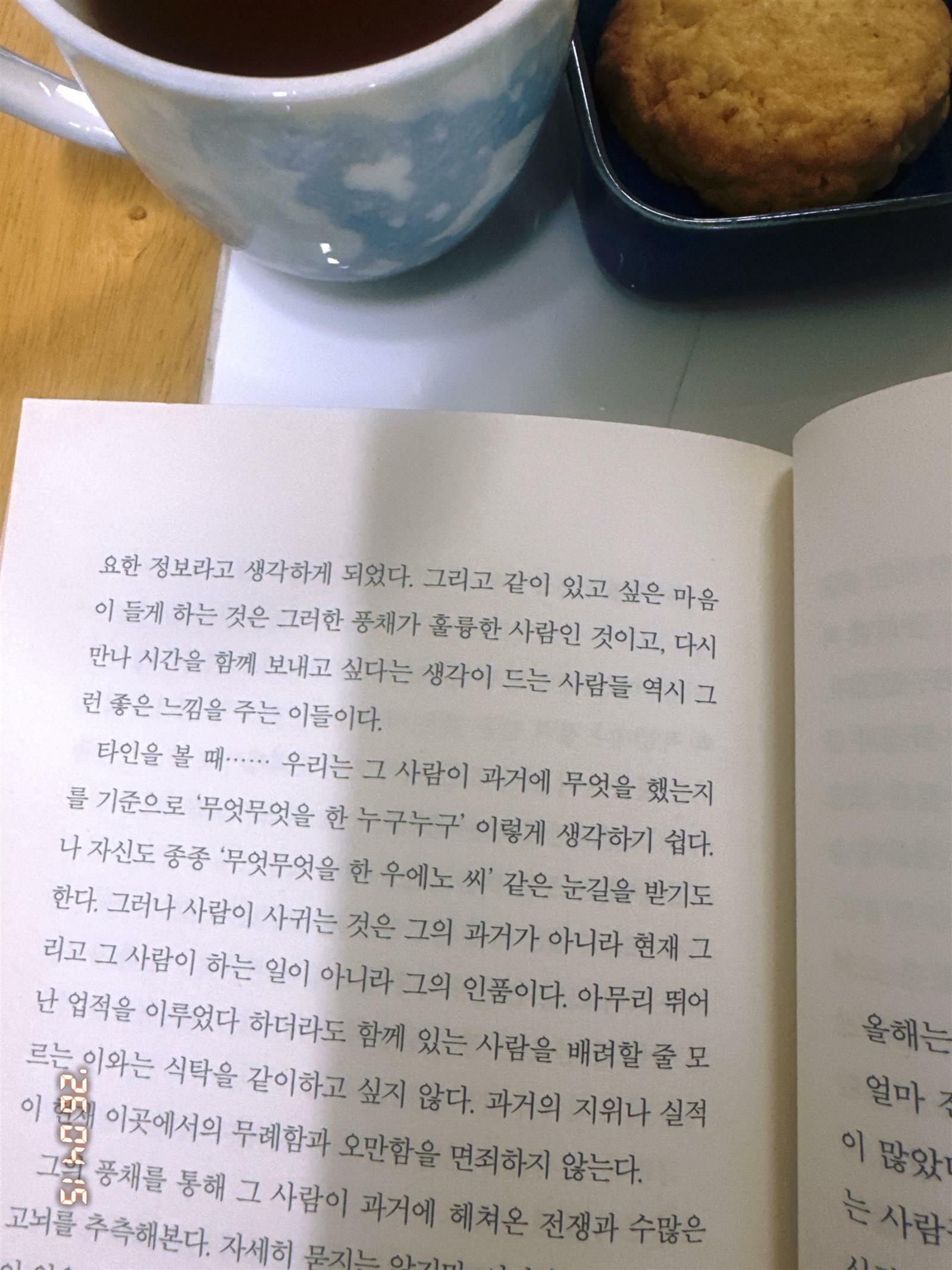 무엇을 하는가가 아니라 누구인가가 중요한 것이다. 그것도 직함이나 지위로는 잴 수 없는 그 사람의 모습, 행동, 말투, 움직이는 방식...... 결국 그 사람의 풍채가 그 사람에 대한 가장 중요한 정보라고 생각하게 되었다. 그리고 같이 있고 싶은 마음이 들게 하는 것은 그러한 풍채가 훌륭한 사람인 것이고, 다시 만나 사람을 함께 보내고 싶다는 생각이 드는 사람들 역시 그런 좋은 느낌을 주는 이들이다.