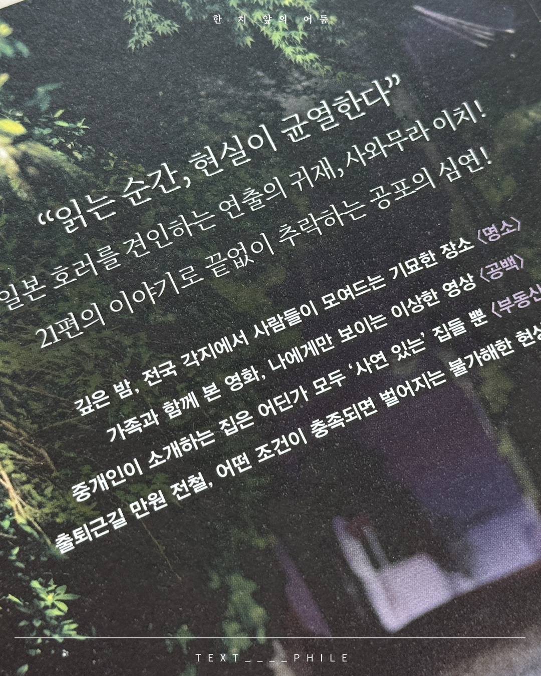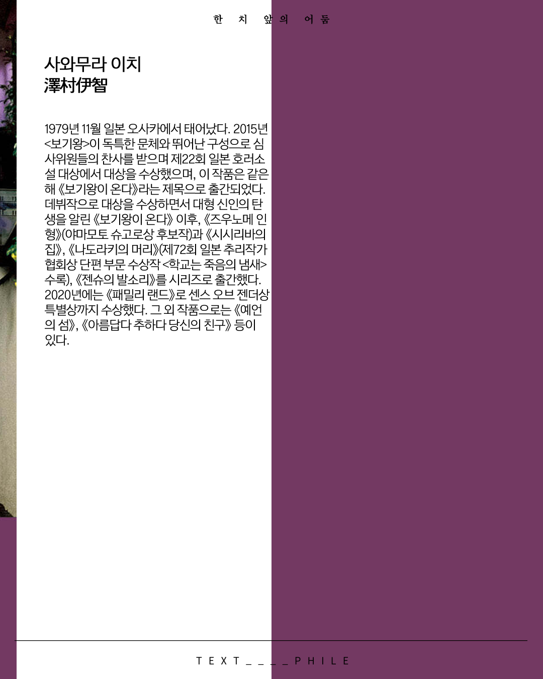 2015년 <보기왕>으로 제22회 일본 호러소설 대상을 수상하며, 'J-호러의 혁신'으로 불리는 사와무라 이치가 처음으로 초단편 괴담집을 출간했다. 21편의 짧은 이야기가 담긴 한 권의 책 제목은 『한 치 앞의 어둠』. 표제작 없이 제목만으로 이 괴담집의 성격을 드러낸다.