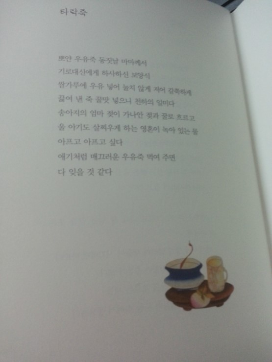 <타락죽>의 화자 역시 타락죽을 너무 좋아하는 나머지 차라리 아프고 싶다는 마음이 설핏 비친다. 이 얼마나 악동적인 화자인가?