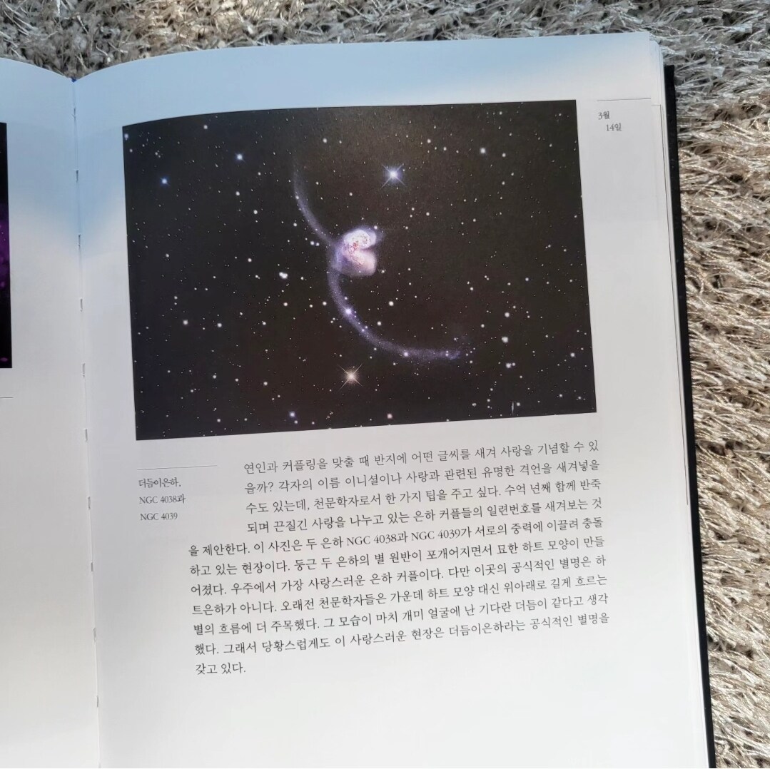 <날마다 우주 한 조각>은 제목대로 매일 날짜별로 우주의 경이로움을 만날 수 있는 책이다. 천문학자이자 과학 유튜버인 지웅배(우주먼지) 님이 지었다:)