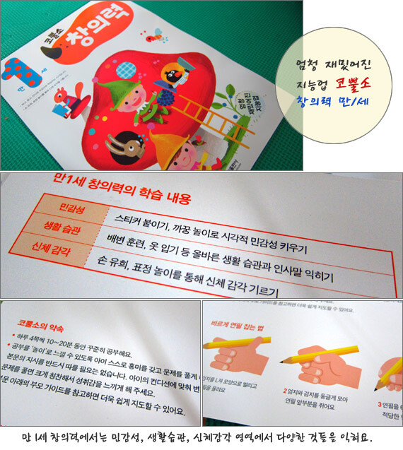 책을 펼쳐보면 앞부분에서 만1세 창의력에 어떠한 내용들을 담았는지 확인할 수 있답니다. 민감성, 생활습관, 신체감각 등을 다양한 활동을 통해서 쑥쑥 키워줄 수 있으니 정말 좋겠죠? 또한 책을 바르게 활용하는 요령과 연필을 바르게 잡는 방법 등 처음 워크북을 접할 때, 알아두면 좋은 정보들을 함께 실어 놓아서 아이 지도에 많은 도움이 되는 것 같습니다. 그럼 책을 펼쳐볼까요?