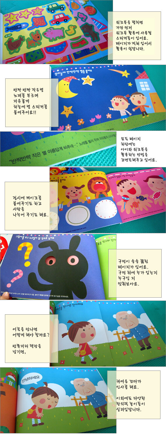 책을 펼쳐보면 한글책 답게 의성어와 의태어가 자주 등장하는 것을 확인 할 수 있답니다. 책에는 다양한 활동들이 담겨져 있는데요. 스티커 붙이기, 선 긋기, 까꿍놀이 뿐만 아니라 구멍이 송송 뚫린 부분, 들춰보기 등 아이가 호기심을 갖고 살펴볼 수 있도록 다양한 활동자료들이 담겨져 있답니다. 우리 아이는 펜 하나를 들고 스티커를 붙이는 곳에도 쓱쓱 그림을 그리기도 하고, 때로는 스티커들을 겹쳐서 붙여보기도 하고, 마음껏 워크북을 활용했어요. 이제 말을 배우고 있는 단계이기 때문에 책을 읽어주며 따라해보기를 유도해보기도 하였어요. 다양한 활동자료가 있어서 지루해하지 않고 스티커를 붙였다가 연필을 들었다가 책을 넘겼다가 하며 재미있게 활용하더라구요.
