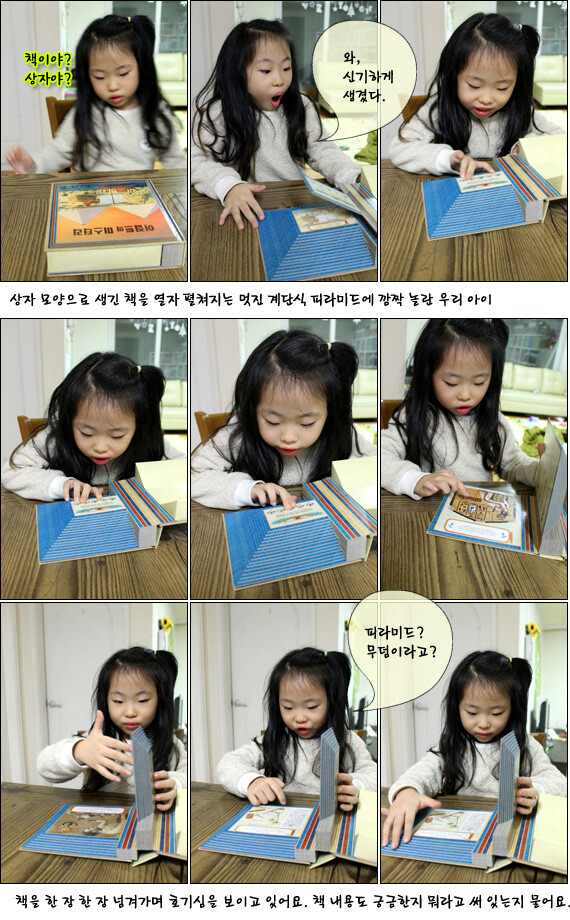 책을 다 읽고 난 후, 약속대로 또 다시 책을 읽어주었는데요. 갑자기 책을 넘겨보다가 책을 가면삼아 해적이 되더라구요. 그런 아이의 모습에 엄마도 해적놀이에 동참했답니다. 안쓰는 천을 잘라서 안대를 만들어주었더니 짧은 칼과 지도가 있어야한다며 집에 있는 물건들을 가져와 허리에 혹은 등 뒤에 차는 모습을 보았답니다. 당당하게 포즈를 잡는 아이의 모습에 웃음이 절로 나왔어요. 재미있는 해적책 덕분에 즐거운 오후 한 때를 보냈답니다. 최근 평면적인 책들을 주로 읽어오다가 오랜만에 독특한 입체북을 읽으니 아이의 독서의욕 자극에 큰 도움이 되는 것 같아요. 책을 읽는 내내 그리고 읽고 난 후, 우리 아이도 재미있어했지만, 읽어주는 엄마도 참 재미있게 읽은 책입니다. |