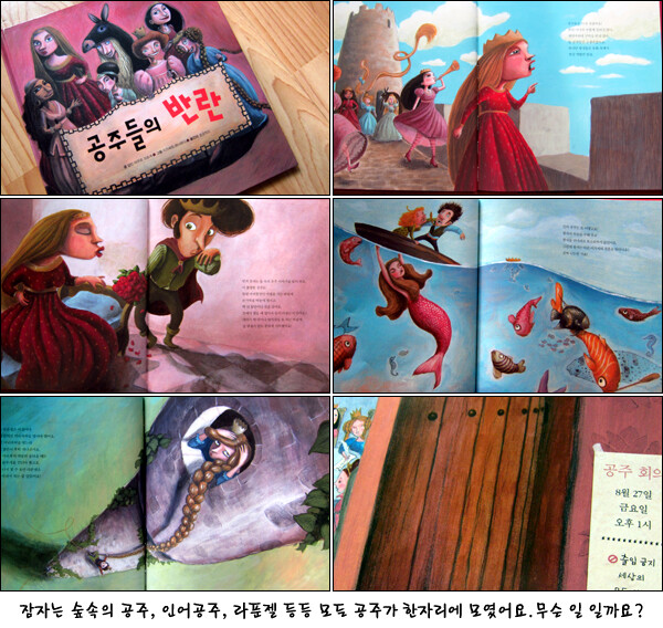 6살난 우리 아이는 아직도 "공주"하면 예쁘고 조신하고 치마만 입고 왕관을 쓰는 전형적인 공주의 모습을 추구하는데요. 아이들에게 공주라는 인상은 여전히 그렇게 남아있는 듯 합니다. 공주의 얌전하고 여성스러운 모습들은 결코 나쁜 모습이 아니기에 아이가 추구하는 공주의 모습, 특히 외모적인 부분에 대해서는 궂이 고쳐줄 필요는 없다고 생각합니다. 하지만, 그 성격만큼은 현대적 공주의 모습이길 바라는 마음이랍니다. 이런 엄마의 바램을 속시원하게 담은 동화책이 있습니다. 바로 <공주들의 반란>인데요. 타 창작동화처럼 새로 등장하는 새로운 공주가 아니라 기존의 공주들이 새로운 마음을 가지게 되는 그런 내용을 담고 있다는 것이 좀 더 특별합니다.
