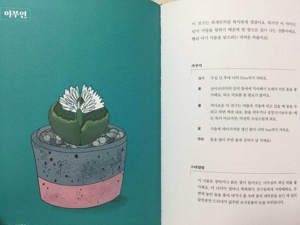 선인장이나 다육식물을 키워보려는 분들에게는 선인장 17종, 다육식물 33종 등, 총 50종의 키우는 방법에 대해서 식물의 특징, 가꾸기 방법, 스타일링에 대해서 설명하고 있어서 자신만의 분위기에 스타일링에 적당한 식물을 선택할 수 있습니다.
