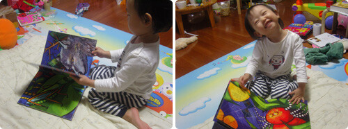 첫 표지의 여우 모녀(? - 우리 공주님의 주장으로는 엄마랜다)는 눈이 왔다갔다 한다. 고슴도치가 데구르르 굴러서 나무 둥치 안으로 들어가기도 하고 귀뚜라미는 펄쩍펄쩍 뛰고, 늑대는 고개를 들어 운다. 밤에 볼 수 있는 생물들이 책속에 한가득한데 그 생물들의 대표적인 움직임들을 스케니메이션으로 표현해놔서 아직 영어를 모르는 아이들도 흥미를 가질 수 있는 책이었다. 운율이 있는 문장들이라서 읽어주기도 좋았는데 아직까지 우리 공주님은 책 속의 글들보다는 그림들에게 관심을 더 많이 쏟고 있다. 커다란 귀뚜라미는 아빠란다. 눈이 좀 무섭게 생겨서 그렇다는데 애니메이션 창의 폴짝폴짝 뛰는 작은 귀뚜라미들은 아기들이라면서 엄마를 찾으러 간대나…? 아이의 기발한 상상력에 한참을 웃기도 했다. 그림들의 색감도 좋고, 밤의 동물들의 생태를 볼 수도 있는 책의 내용도 참 마음에 든 책이다. 책의 맨 뒷페이지에는 책속에 나왔던 생물들의 작은 그림도감이 마련되어 있어서 책을 덮으며 잠시잠깐 책속에서 봤던 것들을 되새겨볼 수 있는 부분도 마음에 들었다. 잠자리 책으로 사용하기에는 아이의 눈을 너무 초롱초롱 만들어버려서 실패했지만 워낙에 마음에 들어하고 자기가 직접 책장에서 가져와서 읽자고 하는 책들 가운데 하나라서 참 만족스러운 선택이었던 것 같다. 우리 공주님이 조금 더 크면 책 속의 영어문장들도 읽어주면서 함께 밤의 생물들의 특성에 대해 살펴보고 싶다.