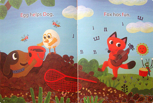 Phonic(발음 중심의 어학 교수법)를 위한 책이라서 그런지 내용 속에 발음을 익힐 수 있도록 재미있는 장치들을 해놨습니다. 예를 들어서 “Egg has a red net.” 이라는 문장이 있는데요. 조그만 알이 빨간 잠자리채 비슷한 것을 들고 있는 그림을 설명하는 문장이었습니다. 그런데 그 문장에 E가 중심이 되어 발음되는 단어가 무려 3개나 되네요. egg, red, net 이렇게 말이지요. 그렇다보니 따라해보면 발음을 그냥 몸으로 익힐 수 있는 거랍니다.