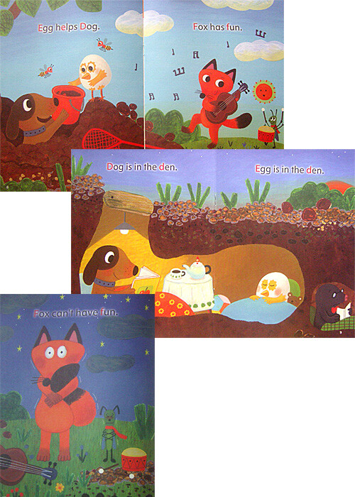 그런 문장들로 재미있는 동화 한편을 만들기가 쉽지 않을텐데 이야기의 내용도 생각보다 재미있습니다. “The Den”의 내용은 개와 알이 함께 열심히 동굴을 만들고 옆에서는 여우가 열심히 놀기만 합니다. 그옆에 같이 북치는 배짱이를 보니 어떤 이야기를 본뜬 것인지 알 수 있었는데요. 잘 만들어진 동굴 안에서 개와 알이 편안히 쉬고 있을 때 여우는 밖에서 추워서 덜덜 떨고 있는 내용이랍니다. 꽤 교훈적인 내용이었지요. 그렇다보니 아이와 함께 재미나게 볼 수 있었습니다.
