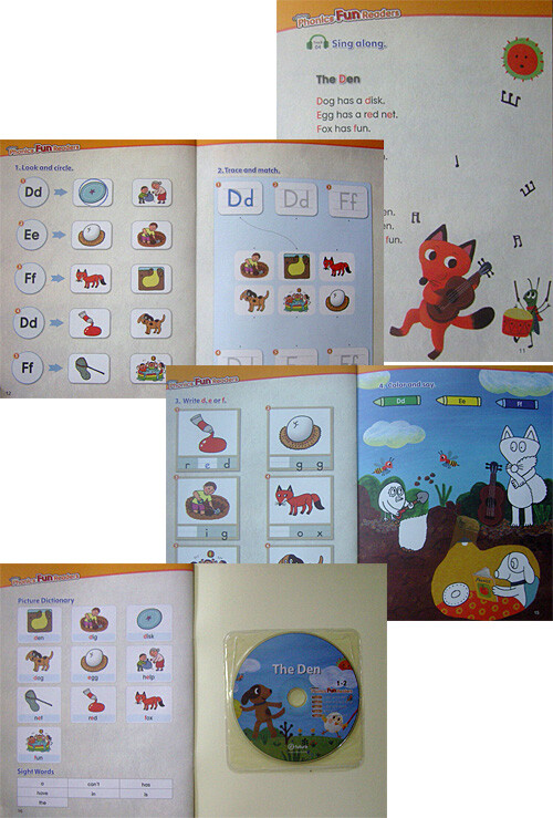 이퓨처의 Phonics Fun Readers 시리즈를 보게 되었습니다. 처음엔 이름도 생소했었는데요. 어머나~ 받아보니 그림이 너무 예쁩니다. 어린 아이들한테는 가장 먼저 보이는 것이 그림이라서 저는 되도록이면 그림도 예쁜 책들을 고르는 것이 습관이 되었어요. 그림이 마음에 안들면 저희 공주님이 거들떠도 안보거든요. 그런데 이 이퓨처의 Phonics Fun Readers 시리즈는 그림들이 모두 합격점이예요. 그리고 생각보다 가격이 비싸지 않아서 왜 그런가 했더니 책이 소프트커버로 되어 있습니다. 일명 페이퍼백이라고도 하더군요. 책이 가벼우니 아이들이 쉽게 손에 들고 돌아다녀도 되서 좋습니다. 하드커버 책들은 오래두고 보기는 좋지만 무거워서 아이들이 들고 다니면 걱정이 되서 조마조마하거든요. 우선은 LEVEL 1의 “The Den”을 봤습니다. 색감이 풍부하고 귀여운 그림이 먼저 눈에 쏙~ 들어옵니다. 멍멍이라면서 좋아하는 저희 공주님도 눈에 들어오네요. 하늘에 해님도 구름도 있고 꽃도 있다면서 하나하나 그림들을 짚어봅니다. 요렇게 흥미를 끌어주고 LEVEL 1이라서 무진장 단순하고 간단한 영어 한문장 씩을 읽어줬습니다. 알아 듣는건지 마는건지 잘 모르겠습니다만 열심히 들어주면서 웃어주니 참 좋더군요. <색감이 풍부하고 귀여운 그림> Phonic(발음 중심의 어학 교수법)를 위한 책이라서 그런지 내용 속에 발음을 익힐 수 있도록 재미있는 장치들을 해놨습니다. 예를 들어서 “Egg has a red net.” 이라는 문장이 있는데요. 조그만 알이 빨간 잠자리채 비슷한 것을 들고 있는 그림을 설명하는 문장이었습니다. 그런데 그 문장에 E가 중심이 되어 발음되는 단어가 무려 3개나 되네요. egg, red, net 이렇게 말이지요. 그렇다보니 따라해보면 발음을 그냥 몸으로 익힐 수 있는 거랍니다. <자연스럽게 발음을 익힐 수 있는 문장들> 그런 문장들로 재미있는 동화 한편을 만들기가 쉽지 않을텐데 이야기의 내용도 생각보다 재미있습니다. “The Den”의 내용은 개와 알이 함께 열심히 동굴을 만들고 옆에서는 여우가 열심히 놀기만 합니다. 그옆에 같이 북치는 배짱이를 보니 어떤 이야기를 본뜬 것인지 알 수 있었는데요. 잘 만들어진 동굴 안에서 개와 알이 편안히 쉬고 있을 때 여우는 밖에서 추워서 덜덜 떨고 있는 내용이랍니다. 꽤 교훈적인 내용이었지요. 그렇다보니 아이와 함께 재미나게 볼 수 있었습니다. <읽기에 재미있는 내용들> 내용은 이렇게 짧은데요. 그렇게 이야기가 끝이 나면 이야기 속의 문장들을 노래로 부를 수 있는 “Sing along”이 있습니다. 부록인 CD와 함께 들어보면 더 좋습니다만, 귀찮으시면 그냥 음을 넣어서 노래하듯이 불러주셔도 괜찮아요. 아이들은 그런 것 참 좋아하니까요. 그리고 그 다음은 간단한 문제들이네요. 맞는 단어를 찾아서 줄긋기도 있고, 빠진 글자를 채우는 부분도 있고, 색칠공부도 있습니다. 굳이 다 풀려고 하지 않아도 그림들을 보면서 문제풀이에 흥미를 보이게 할 수는 있겠더라고요. 그리고 맨 마지막 페이지에는 “Picture Dictionary”가 있어서 손쉽게 단어를 보고 외울수 있는 단어카드들이 있습니다. 단, 크기가 좀 작다는게 아쉽더군요. 조금만 더 크다면 오려서 아이와 함께 카드놀이를 하면서 놀아도 좋을 것 같았거든요. <여러 종류의 책 내용에 관한 퀴즈들과 음원 CD> 지금가지가 제가 이퓨처의 Phonics Fun Readers 시리즈를 보게 된 소감이었습니다. 이제 4살밖에 안된 딸래미지만 생각보다 많은 것들을 따라서 하고 함께 놀 수 있는 책이었어요. 단계가 올라가면 올라갈수록 문장도 길어지고 어려운 단어들도 많이 나오게 된다는 사실은 다들 아시겠죠. 지금 저희 공주님의 수준에 LEVEL 1과 2가 가장 잘 맞아서 재미있게 보고 있습니다. 생각보다 좋은 책으로 공주님과 같이 놀 수 있어서 참 좋았어요~