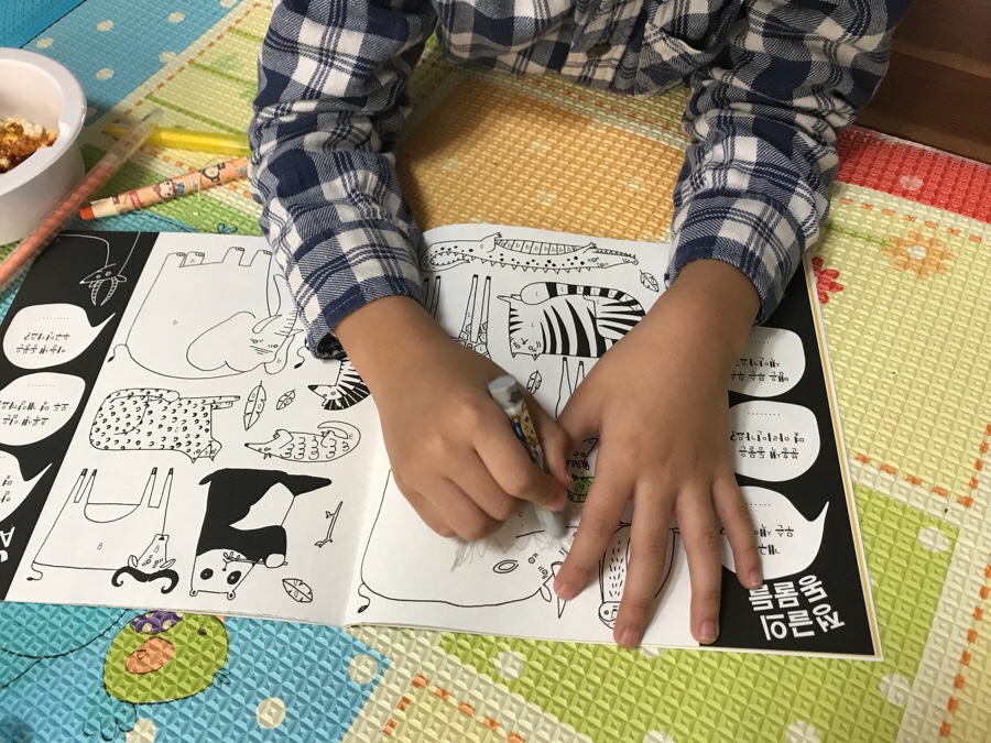 책을 받았는데 그림도 간결하고 귀여웠다. 10가지 색을 사용하여 색칠을 할 수 있도록 색깔 표도 있었지만 아이가 그렇게 딱~ 짜여 있는대로 하는결 별로 안좋아해서 칠하고 싶은 책으로 맘껏 칠하라고 했다. 그러니 더 좋아했다. 일단은 자신이 좋아하는 동물들이라서 거부감 없이 함께 볼 수 있다는 사실이 감격스러웠다. 색칠공부의 '색'자도 싫어하던 애가 열심히 동물들을 찾고 색칠하는 것을 보니 너무 좋았다.