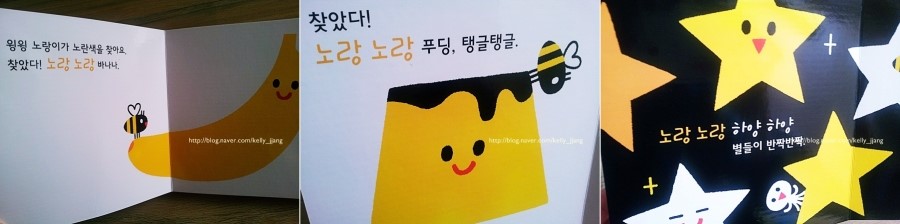 노랑이가 노란색 사물을 찾을 때마다 내는 의성어, 의태어를 흉내내며